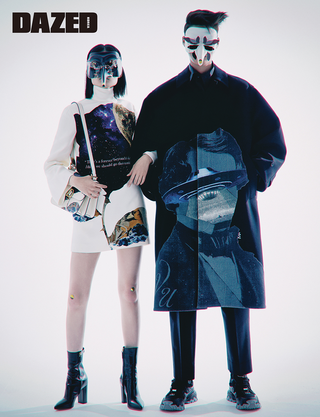 태희가 착용한 그래픽 저지 드레스는 발렌티노 – 언더커버(Valentino – Undercover), 프린트 백은 발렌티노 가라바니 – 언더커버(Valentino Garavani- Undercover), 부츠는 발렌티노 가라바니(Valentino Garavani), 재형이 입은 베토벤 프린트 코트와 이너로 입은 나일론 셔츠, 팬츠는 모두 발렌티노 – 언더커버(Valentino – Undercover), 스니커즈는 발렌티노 가라바니(Valentino Garavani), 코끼리 마스크 위에 쓴, 잠자리에서 영감받은 아이웨어는 모두 갓썸웨어(Godsomware).