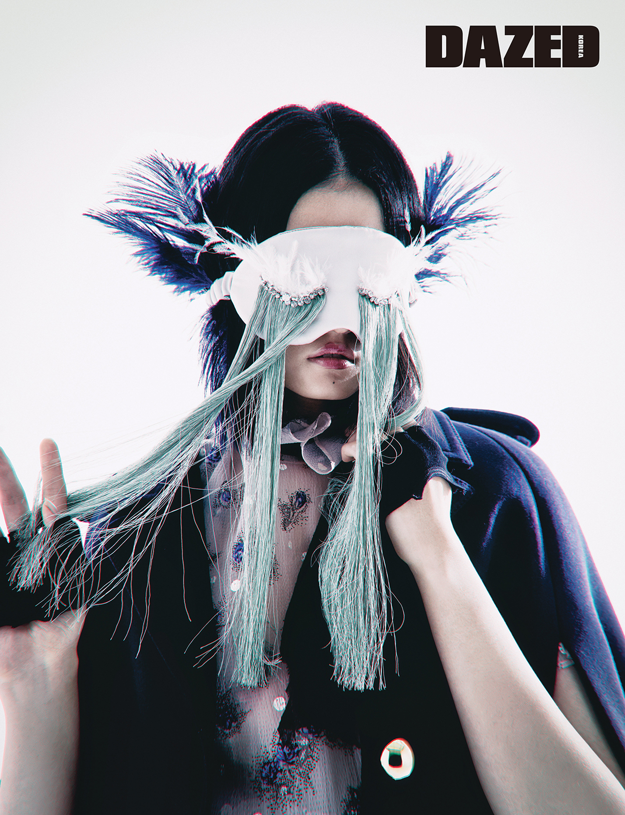 거대한 케이프와 장미를 자수 처리한 블라우스, 브리프, 레이스업 부츠는 모두 미우 미우(Miu Miu), 비즈와 태슬 장식 아이 마스크는 뮤크 스튜디오(Muk Studio).