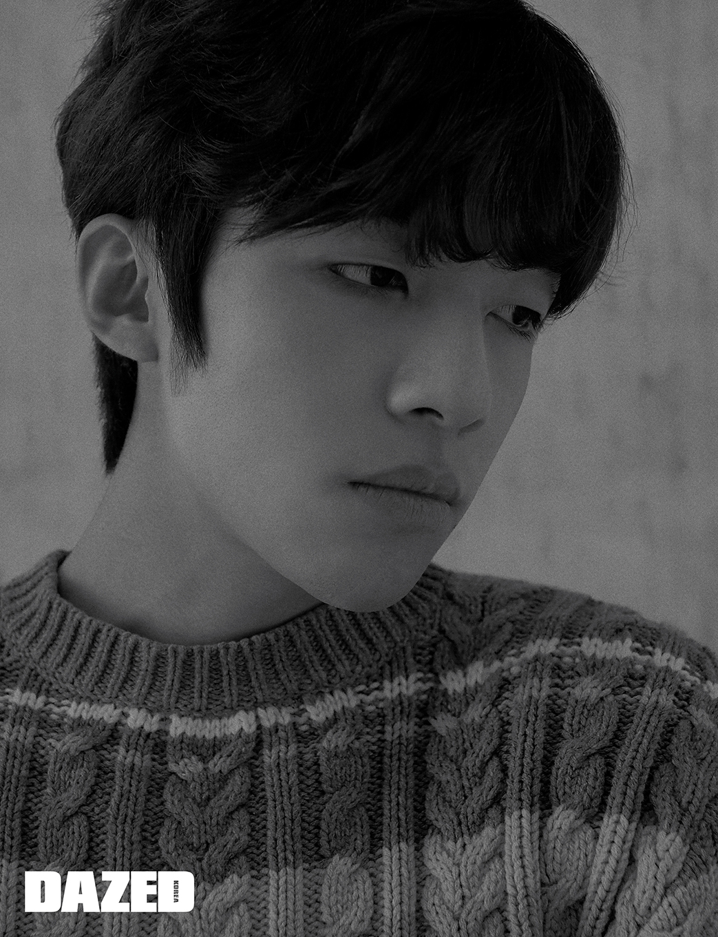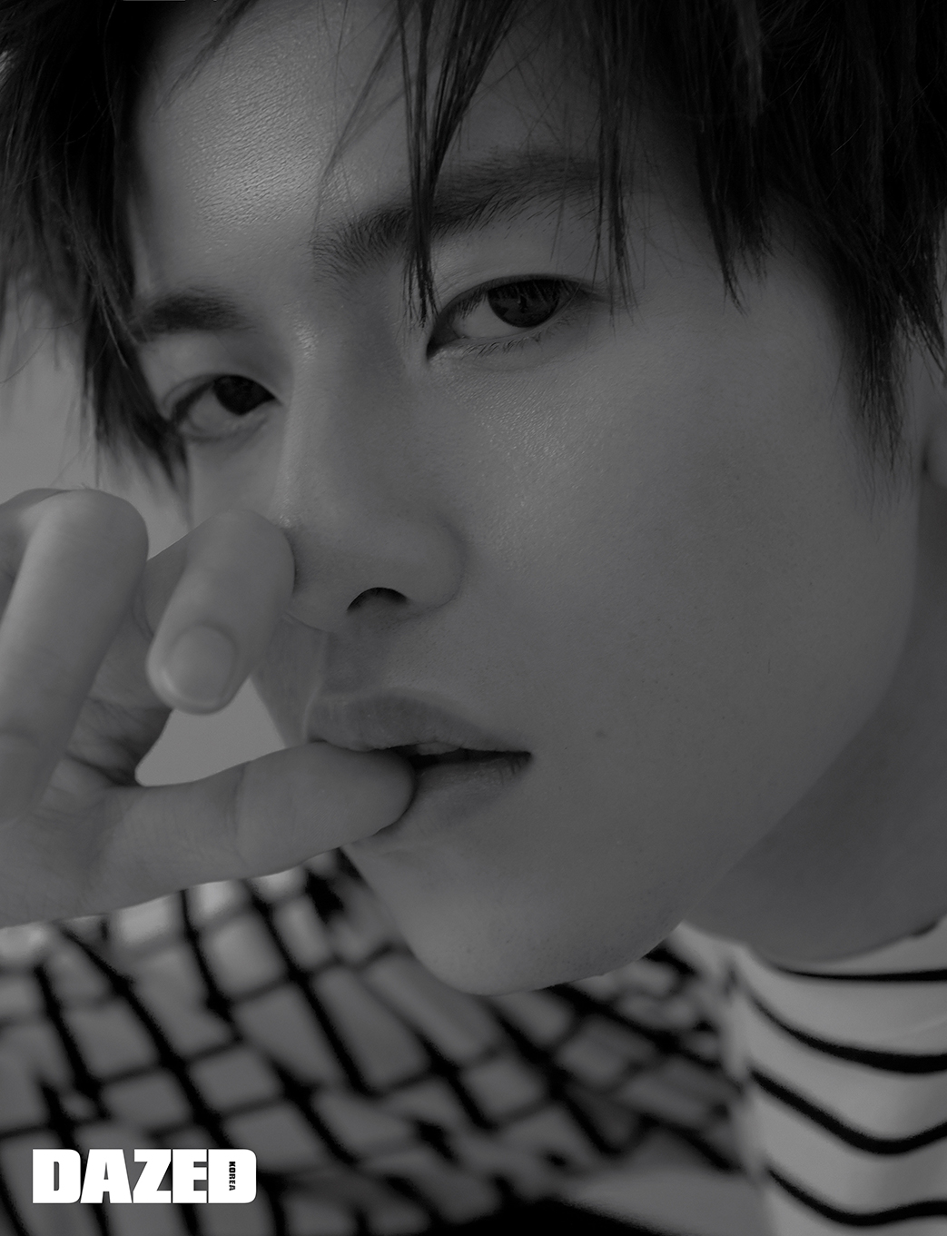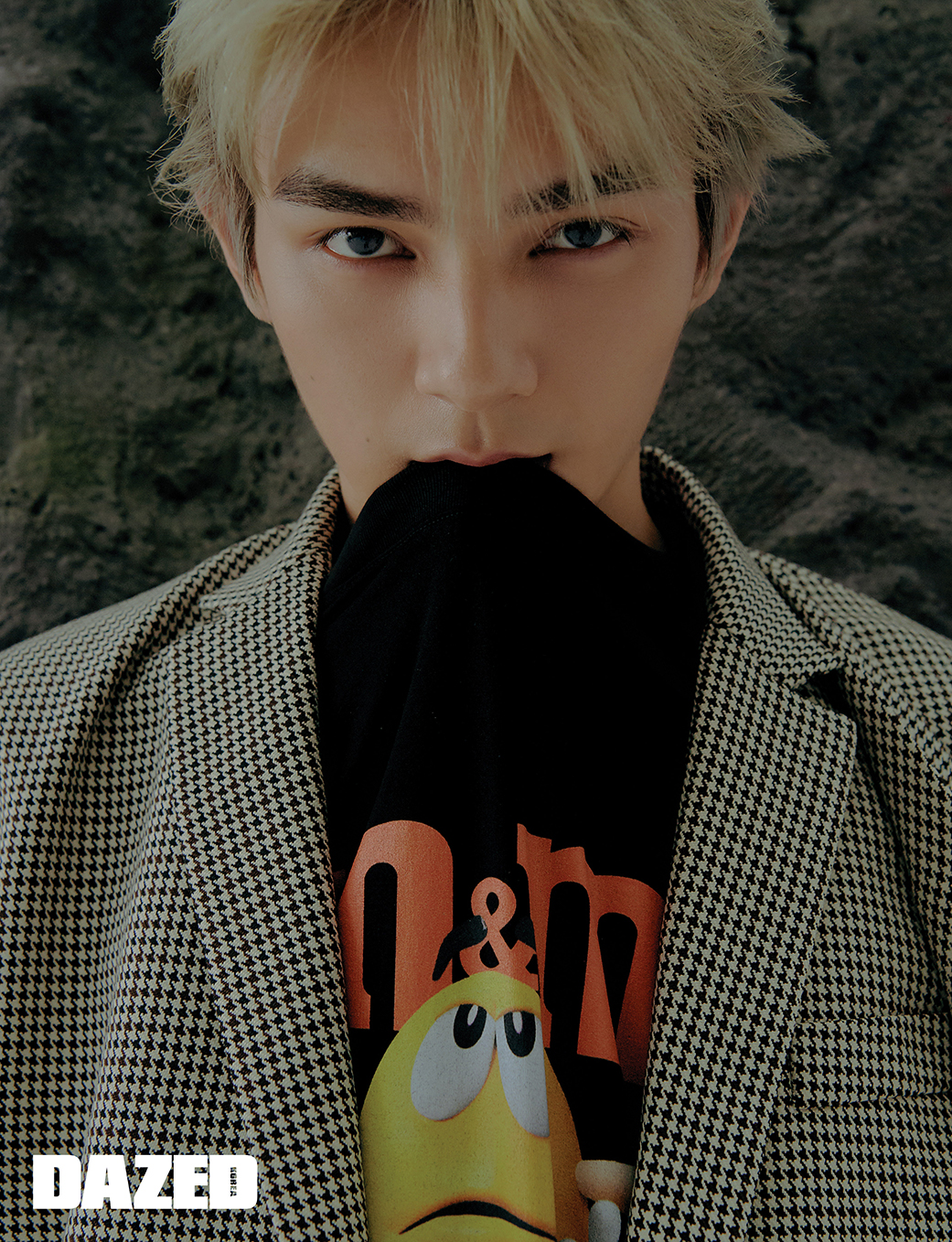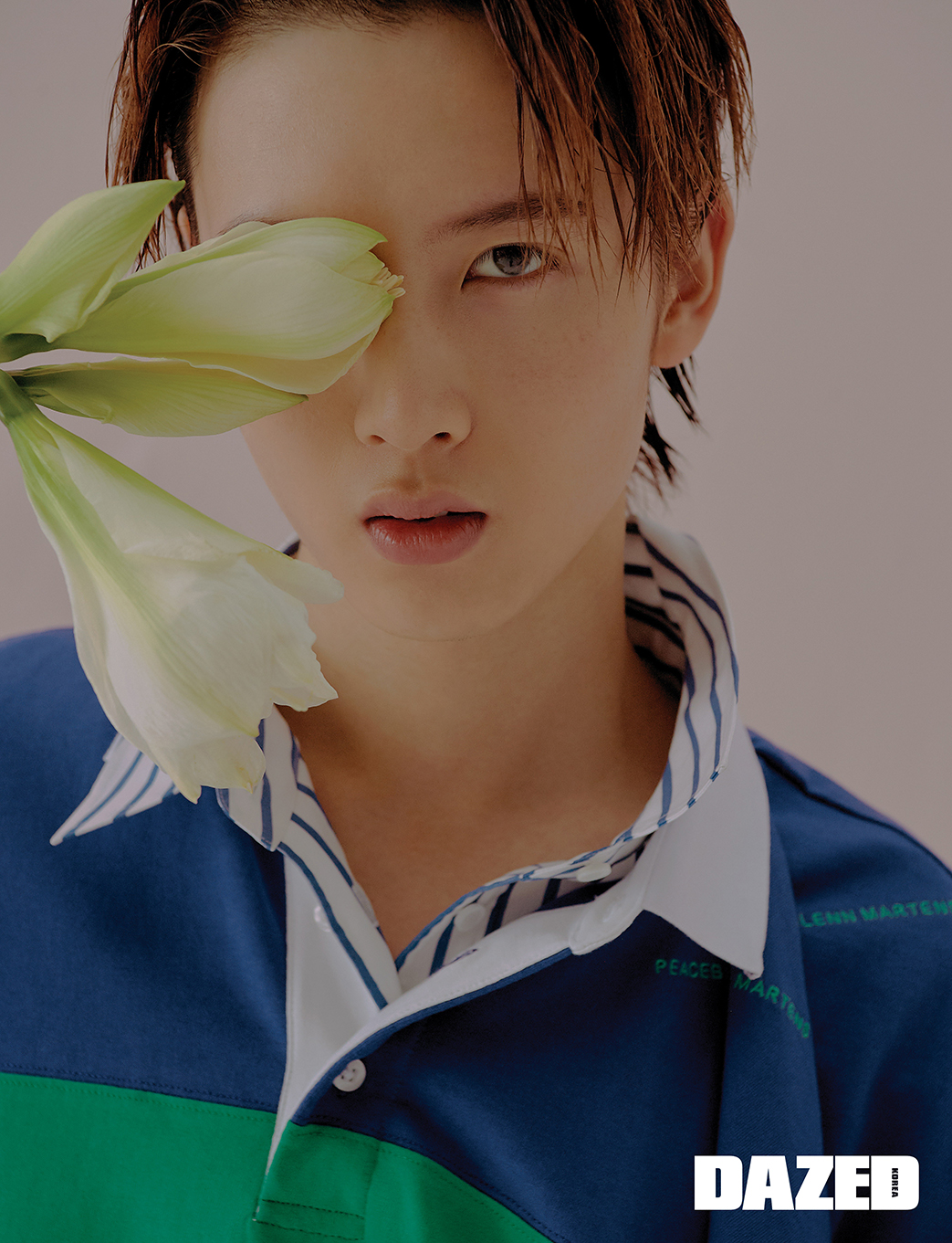 독특한 실루엣의 피케 셔츠와 블랙 팬츠는 피스버드맨(Peacebird Men), 이너로 입은 스트라이프 셔츠는 준지(Juun.J), 워커 부츠는 닥터마틴(Dr. Martens).