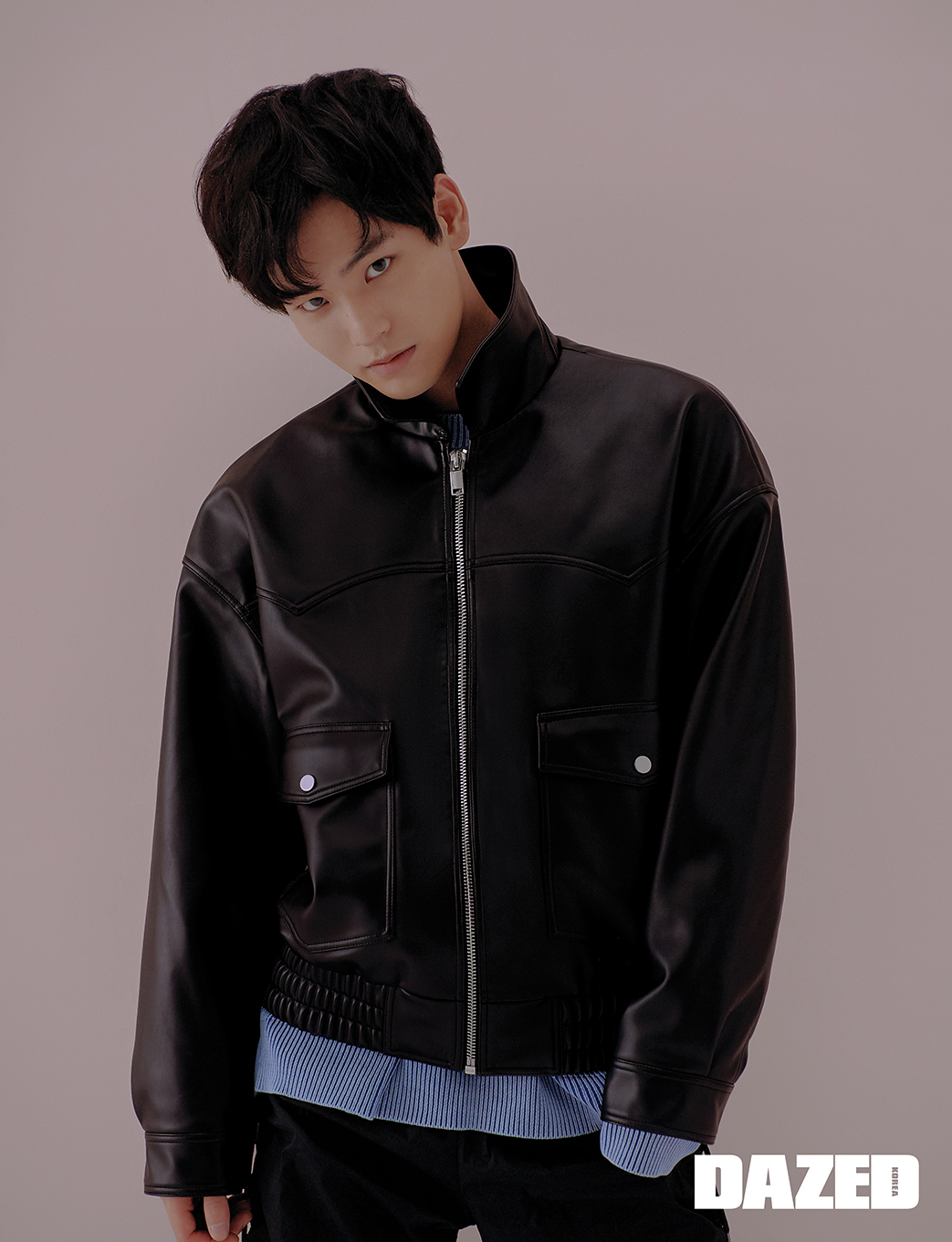 레더 재킷과 이너로 입은 블루 스웨터, 팬츠는 모두 피스버드맨(Peacebird Men).