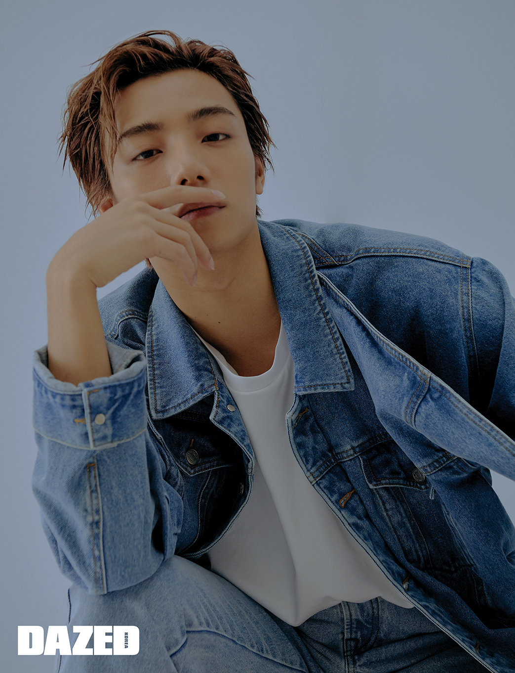 데님 재킷과 팬츠, 이너로 입은 화이트 톱은 모두 피스버드맨(Peacebird Men).
