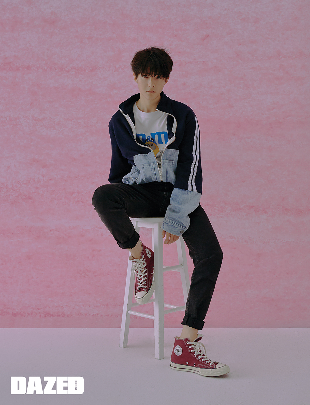 데님 장식 트랙 재킷과 이너로 입은 프린트 톱은 피스버드맨(Peacebird Men), 블랙 데님 팬츠는 리바이스(Levi’s), 스니커즈는 컨버스(Converse).