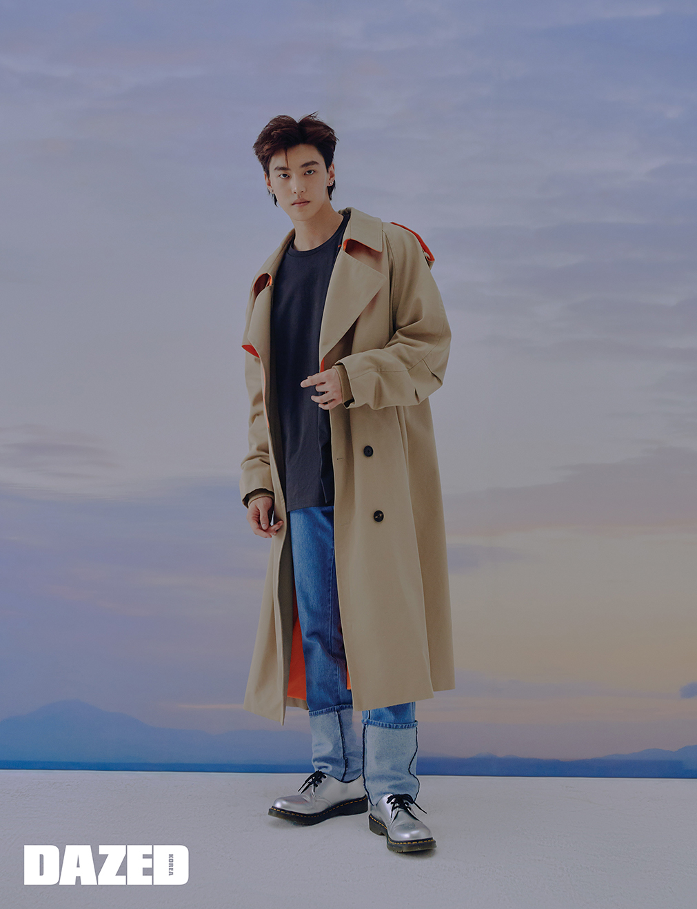 트렌치코트와 데님 팬츠, 이너로 입은 톱은 모두 피스버드맨(Peacebird Men), 실버 구두는 닥터마틴(Dr. Martens).
