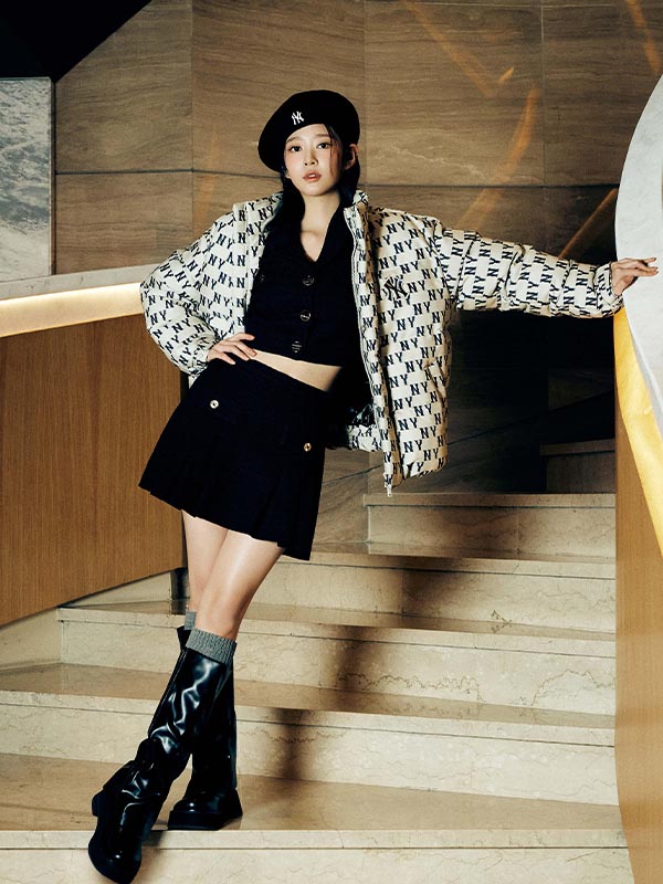 보온성과 스타일, 둘 중 어느 하나 포기할 수 없는 연말 모임. 김민주와 MLB가 완성한 힙한 패딩 룩을 참고하자.