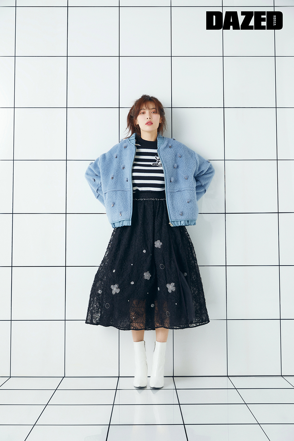 폼폼 장식 보머 재킷과 줄무늬 니트 톱, 레이스 스커트는 모두 오즈세컨(O’2nd), 슈즈는 브리아나(Briana).