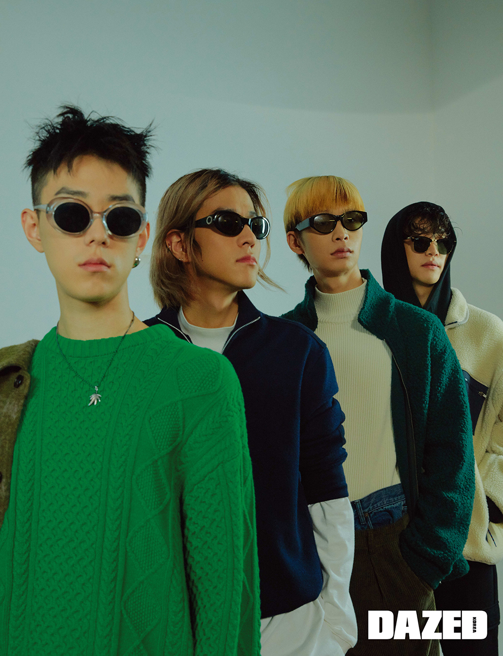 지훈이 입은 집업 톱과 티셔츠, 팬츠는 모두 스튜디오 톰보이(Studio Tomboy), 선글라스와 스니커즈는 스타일리스트의 것.