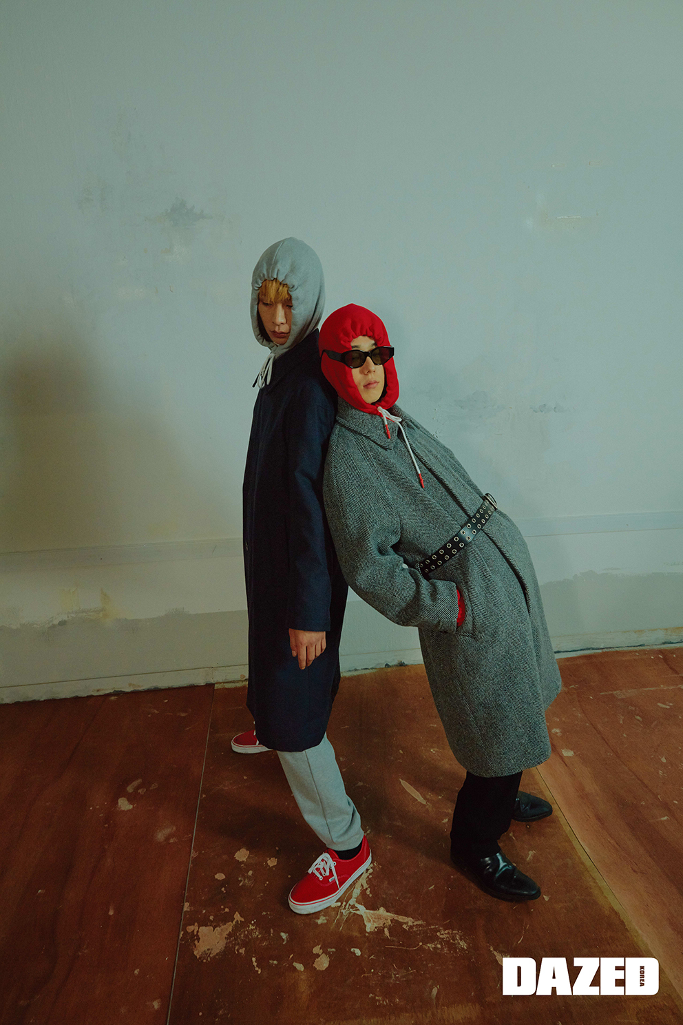 진혁이 입은 코트와 후디, 조거 팬츠는 모두 스튜디오 톰보이(Studio Tomboy), 양말과 스니커즈는 스타일리스트의 것.