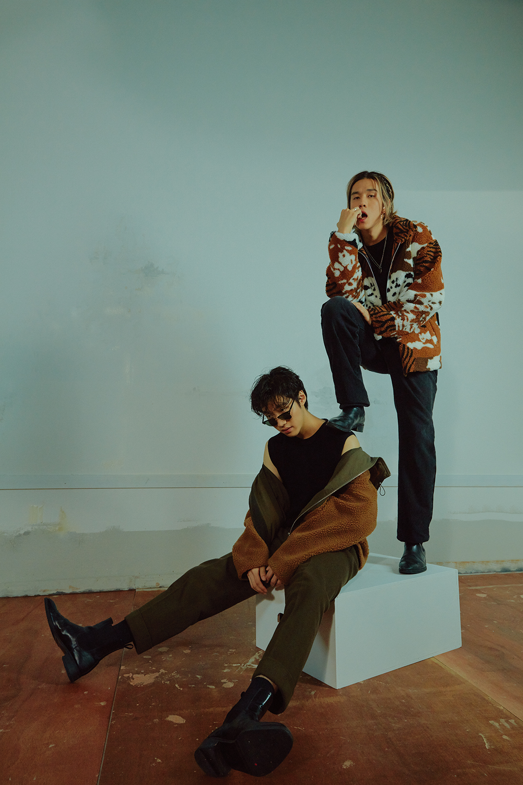 지훈이 입은 플리스 재킷과 니트 톱, 팬츠는 모두 스튜디오 톰보이(Studio Tomboy), 목걸이와 반지, 부츠는 모두 스타일리스트의 것.