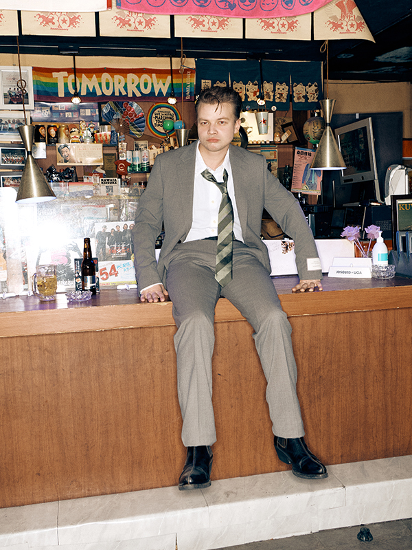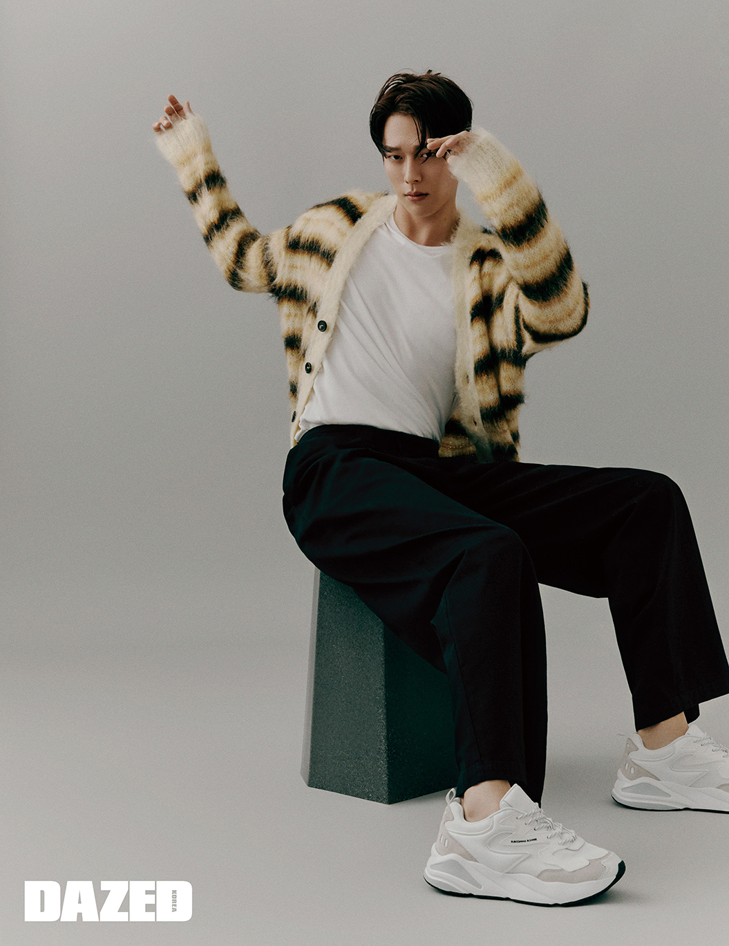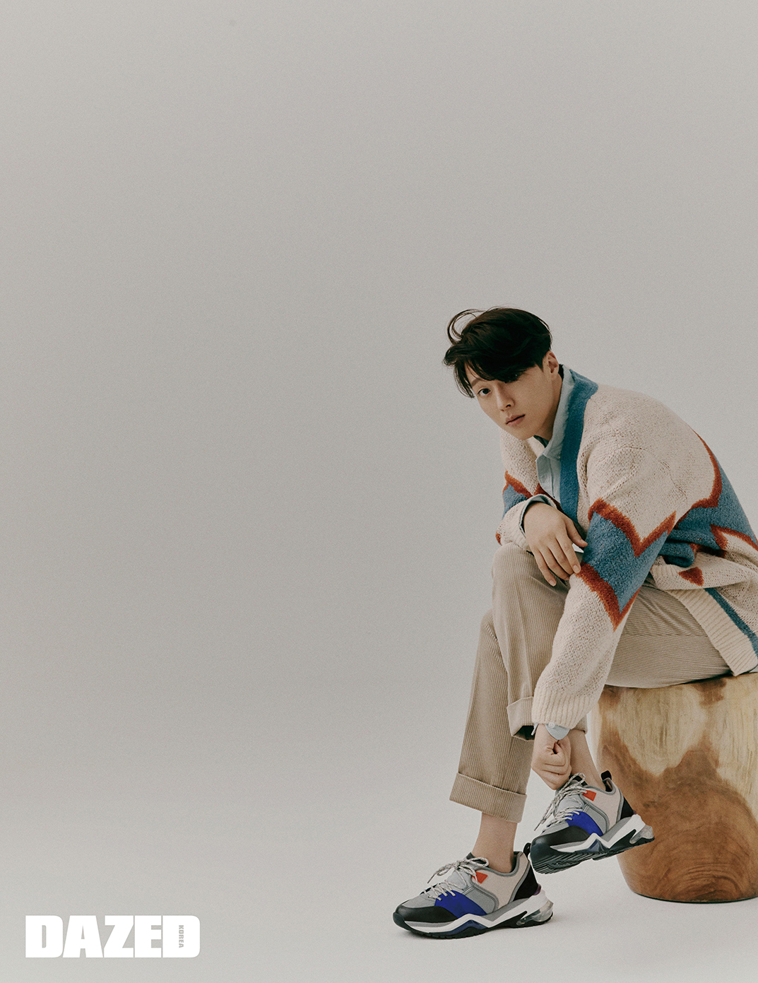 니트 카디건은 리버클래시(Liberclassy), 이너로 입은 셔츠는 클럽모나코(Club Monaco), 코듀로이 팬츠는 맨온더분(Man On The Boon), 피어 스니커즈는 슈콤마보니(Suecomma Bonnie).