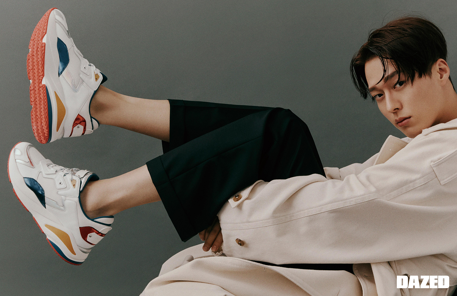 트렌치코트는 인스턴트펑크(InstantFunk), 와이드 팬츠는 발렌티노 by 무이(Valentino by Mue), 퀸즈 스니커즈는 슈콤마보니(Suecomma Bonnie).