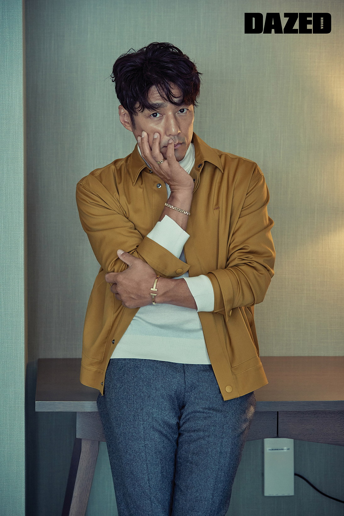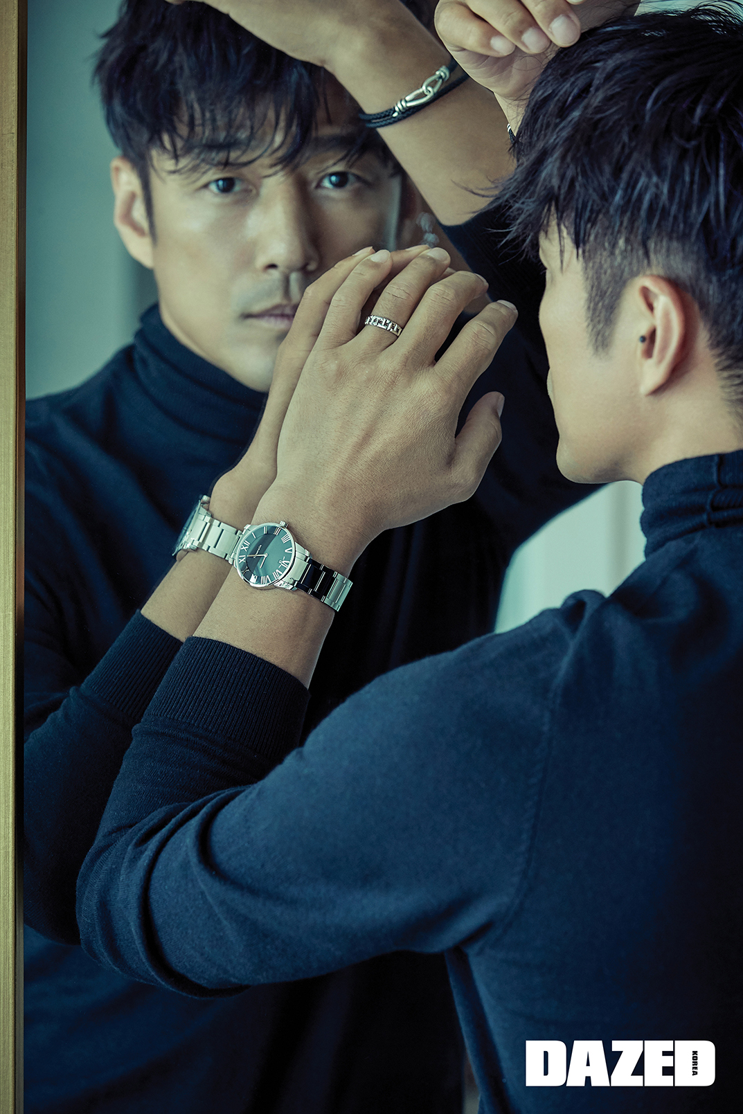 왼손에 착용한 티파니 T 스퀘어 브레이슬릿과 오른손에 착용한 옐로 골드 티파니 T 트루 내로우 브레이슬릿, 티파니 T 트루 와이드링은 모두 티파니(Tiffany&Co.), 화이트 터틀넥과 울 소재 버튼다운 셔츠는 에르메네질도 제냐 XXX(Ermenegildo Zegna XXX), 그레이 팬츠는 S.T. 듀퐁(S.T.Dupont).