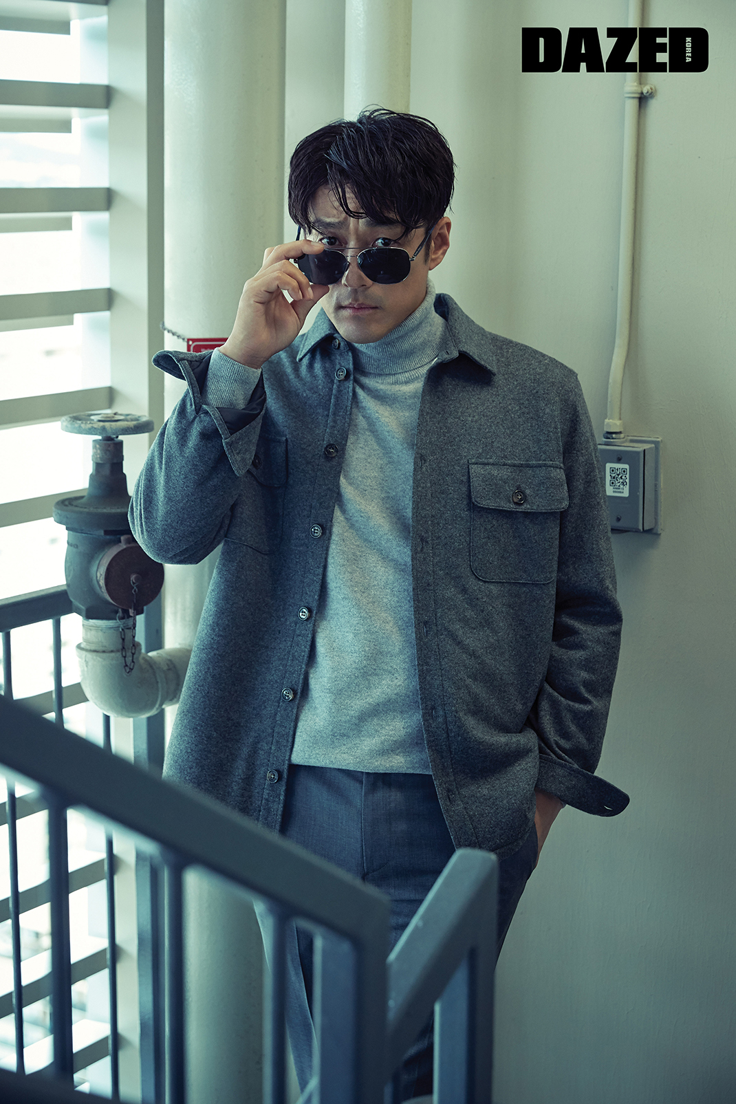스틸 프레임의 보잉 선글라스는 보스 아이웨어(Boss Eyewear), 그레이 터틀넥은 에스.티.듀퐁(S.T. Dupont), 캐시미어 라이트 저지 소재의 셔츠는 로로 피아나(Loro Piana), 그레이 팬츠는 맨온더분(Man On The Boon).