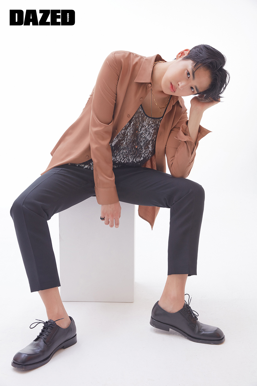 셔츠와 톱, 팬츠는 모두 김서룡(kimseoryong), 슈즈는 COS, 네크리스는 미네타니(Minetani).
