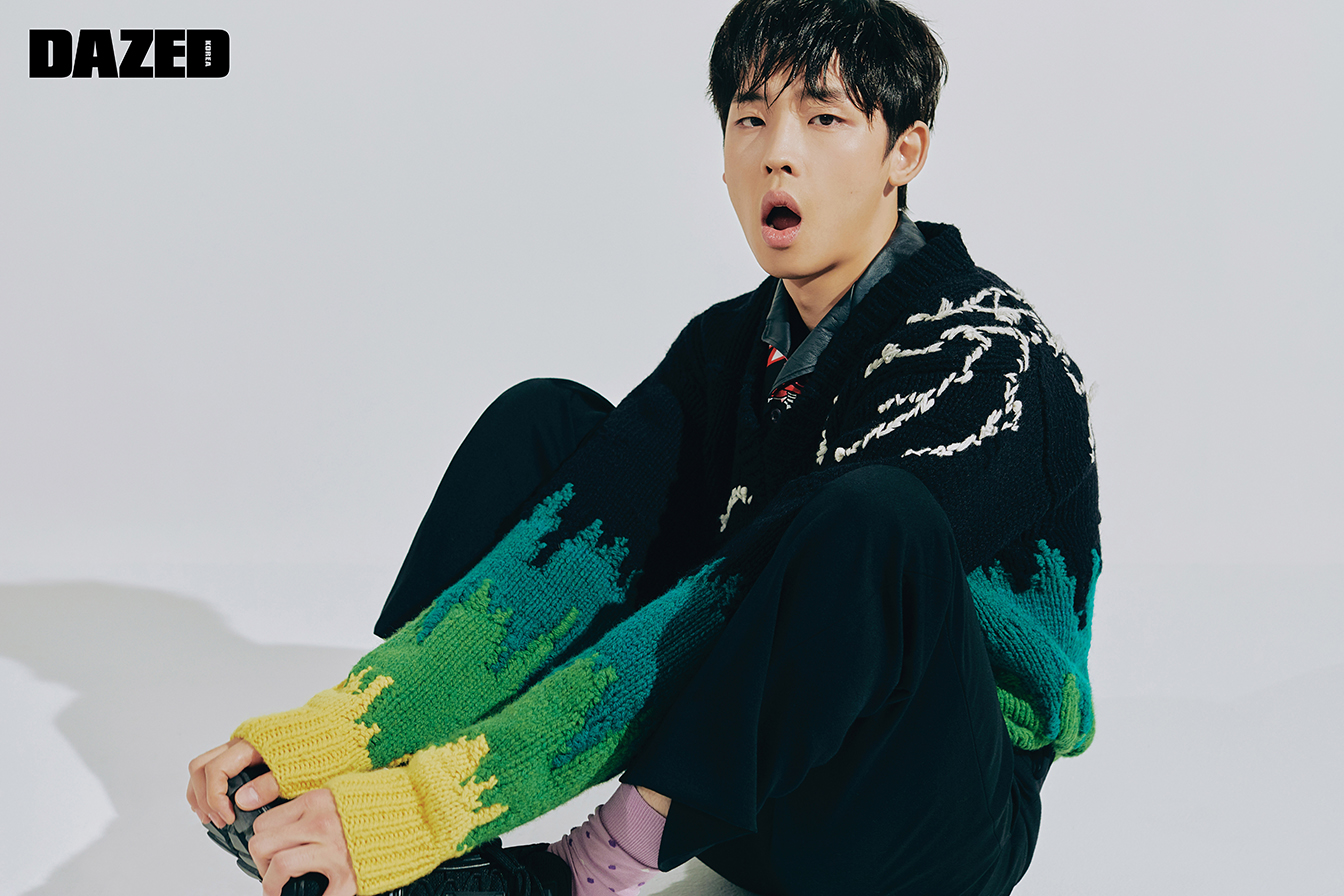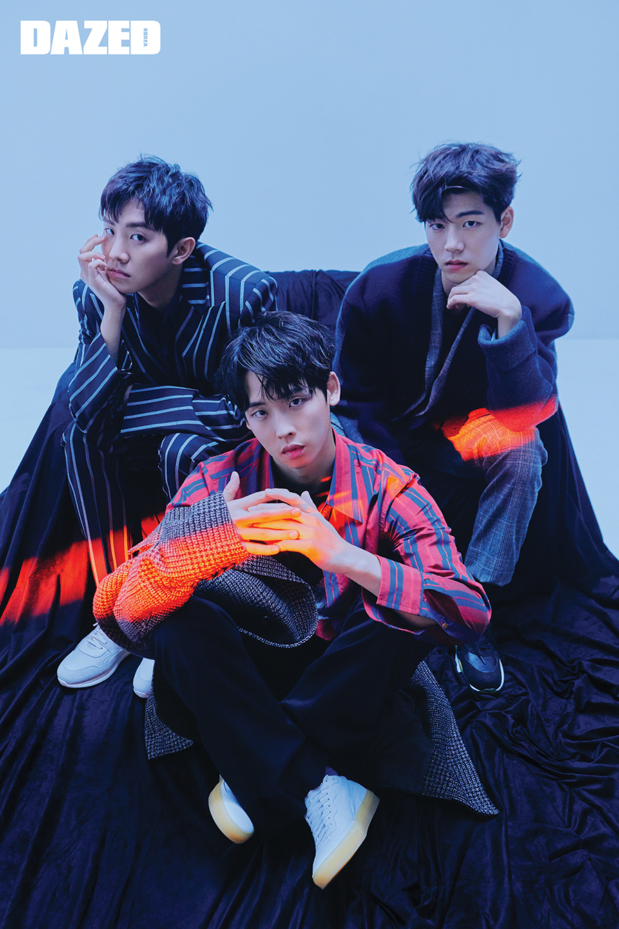 형석이 입은 스트라이프 슈트는 비비안 웨스트우드(Vivienne Westwood), 안에 입은 베스트는 옴펨(Homfem), 셔츠는 로리엣(Roliat), 스니커즈는 S.T. 듀퐁 슈즈(S.T. Dupont Shoes). 현성이 입은 카디건은 메종 키츠네 by 비이커(Masion Kitsune by Beaker), 안에 입은 체크 슈트는 8 by 육스(8 by YOOX), 스니커즈는 렉켄(Rekken), 티셔츠는 스타일리스트의 것. 정우가 입은 스트라이프 셔츠와 티셔츠는 비비안 웨스트우드(Vivienne Westwood), 팬츠는 김서룡(Kimseoryong), 스니커즈는 S.T. 듀퐁 슈즈(S.T. Dupont Shoes).