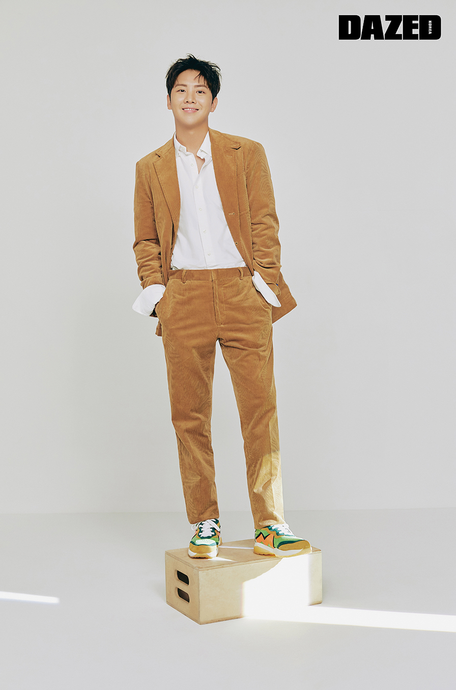 형석이 입은 코듀로이 슈트와 화이트 셔츠는 폴로 랄프 로렌(Polo Ralph Lauren), 슈즈는 렉켄(Rekken).