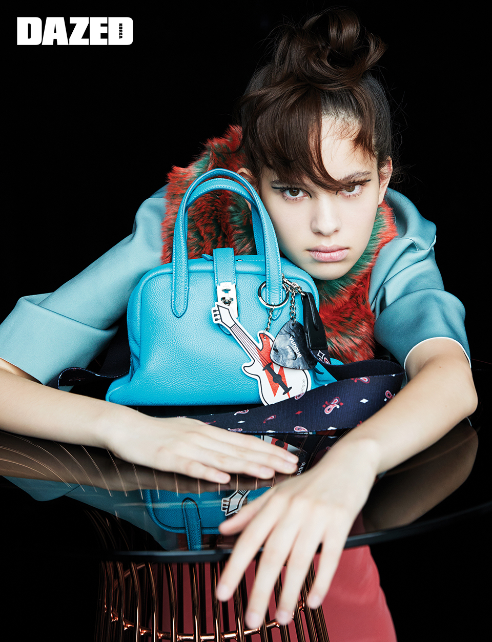 실크 톱과 스커트, 목에 두른 퍼는 모두 드리스 반 노튼(Dries Van Noten), 터키시 블루 컬러의 스몰 토크 백, 기타 모양 참과 기타 피크 모양 참, 블랙 컬러 페이즐리 패턴 위빙 스트랩은 모두 분크(vunque).