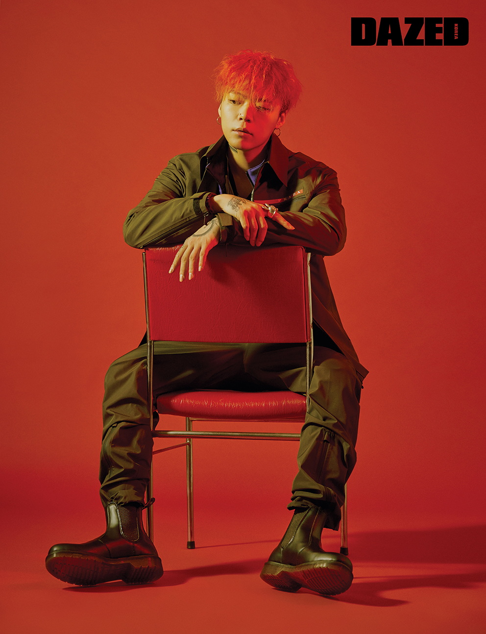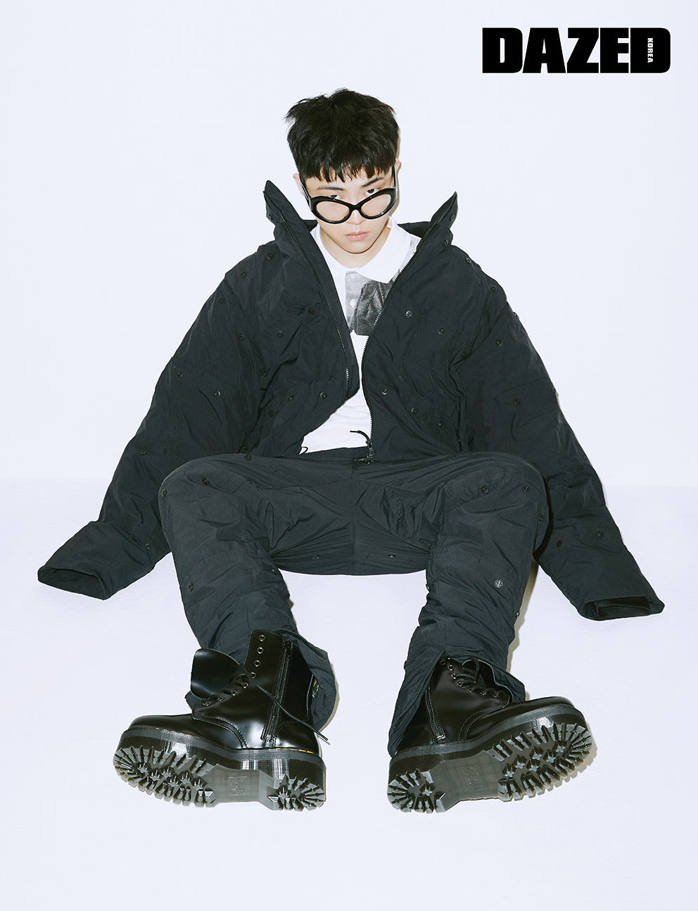 기리보이가 입은 코트는 젠더주 X 젠틀몬스터 by 아이코스튬(Xander Chou X Gentle Monster by Ikoes.tume), 팬츠는 팸(P.A.M), 부드러운 나파 가죽 소재로 편안한 착화감을 자랑하는 1460 부츠는 닥터마틴(Dr. Martens), 아이웨어는 아이사피(I4P), 글러브는 존 로런스 설리번(John Lawrence Sullivan).