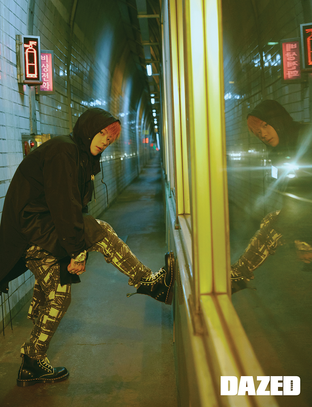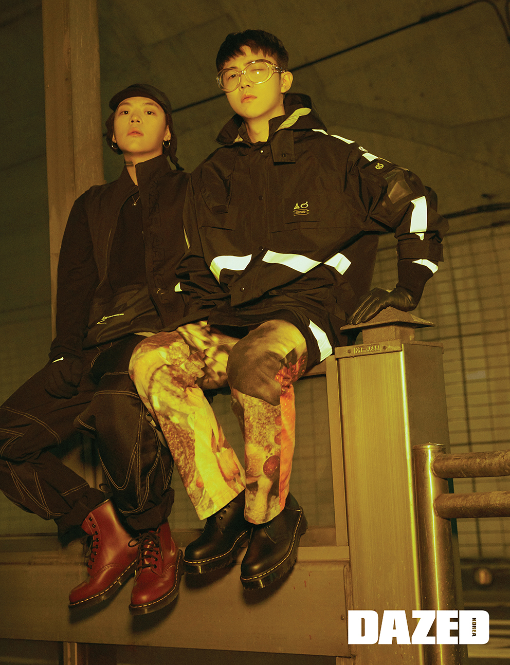 패딩 코트와 팬츠는 포스트 아카이브 팩션 (파프)(Post Archive Faction (PAF)), 화이트 티셔츠는 프레드 페리(Fred Perry), 쿼드 레트로 아웃솔과 옐로 스티치로 펑키한 무드를 자아내는 부츠는 닥터마틴(Dr. Martens).