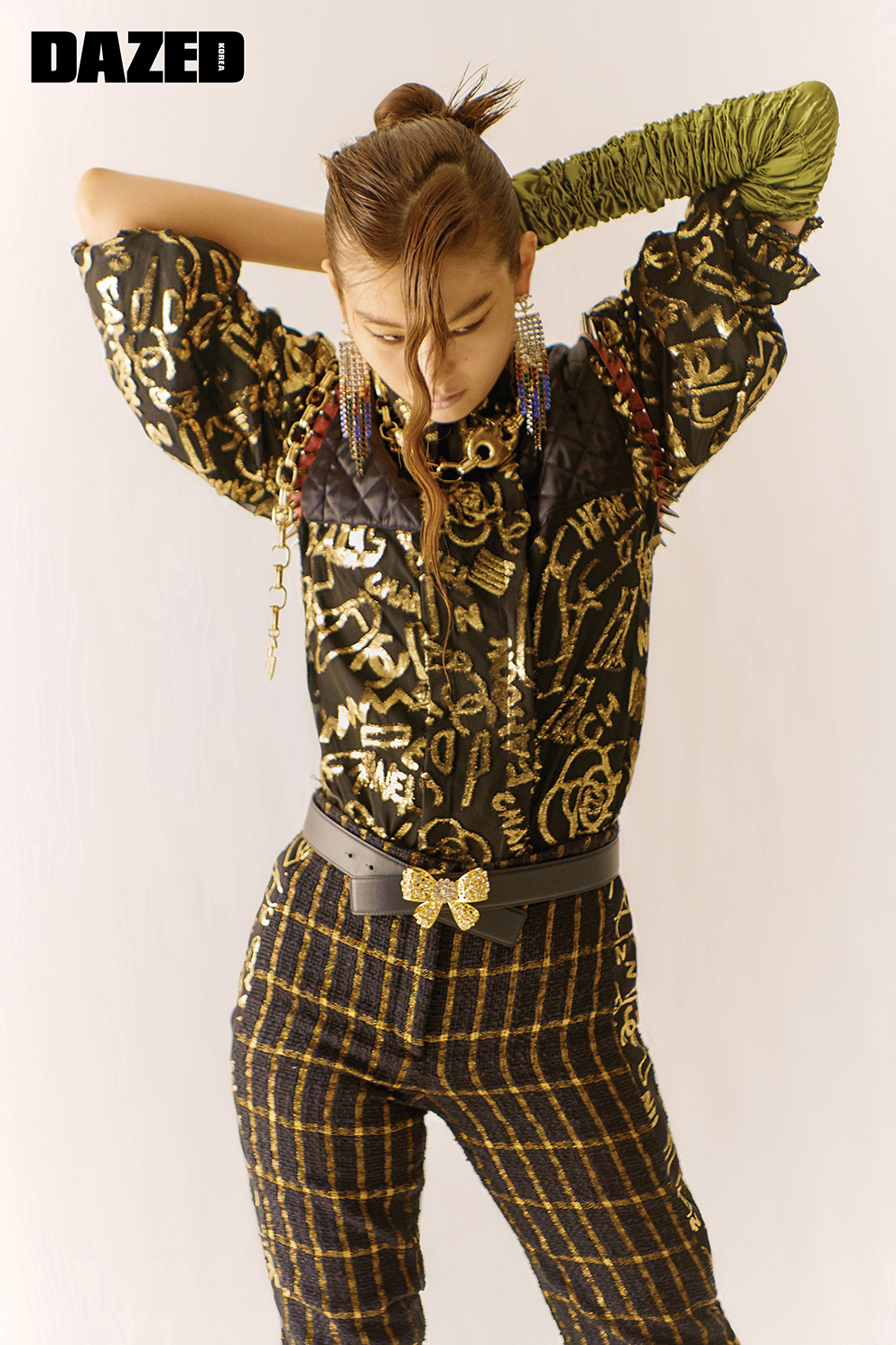 금색 그라피티 퀼팅 디테일 셔츠, 격자무늬 팬츠, 이어링은 모두 샤넬(Chanel), 리본 장식 벨트는 베르사체(Versace), 네크리스로 연출한 체인과 어깨에 두른 서스펜더, 새틴 글러브는 모두 구찌(Gucci).