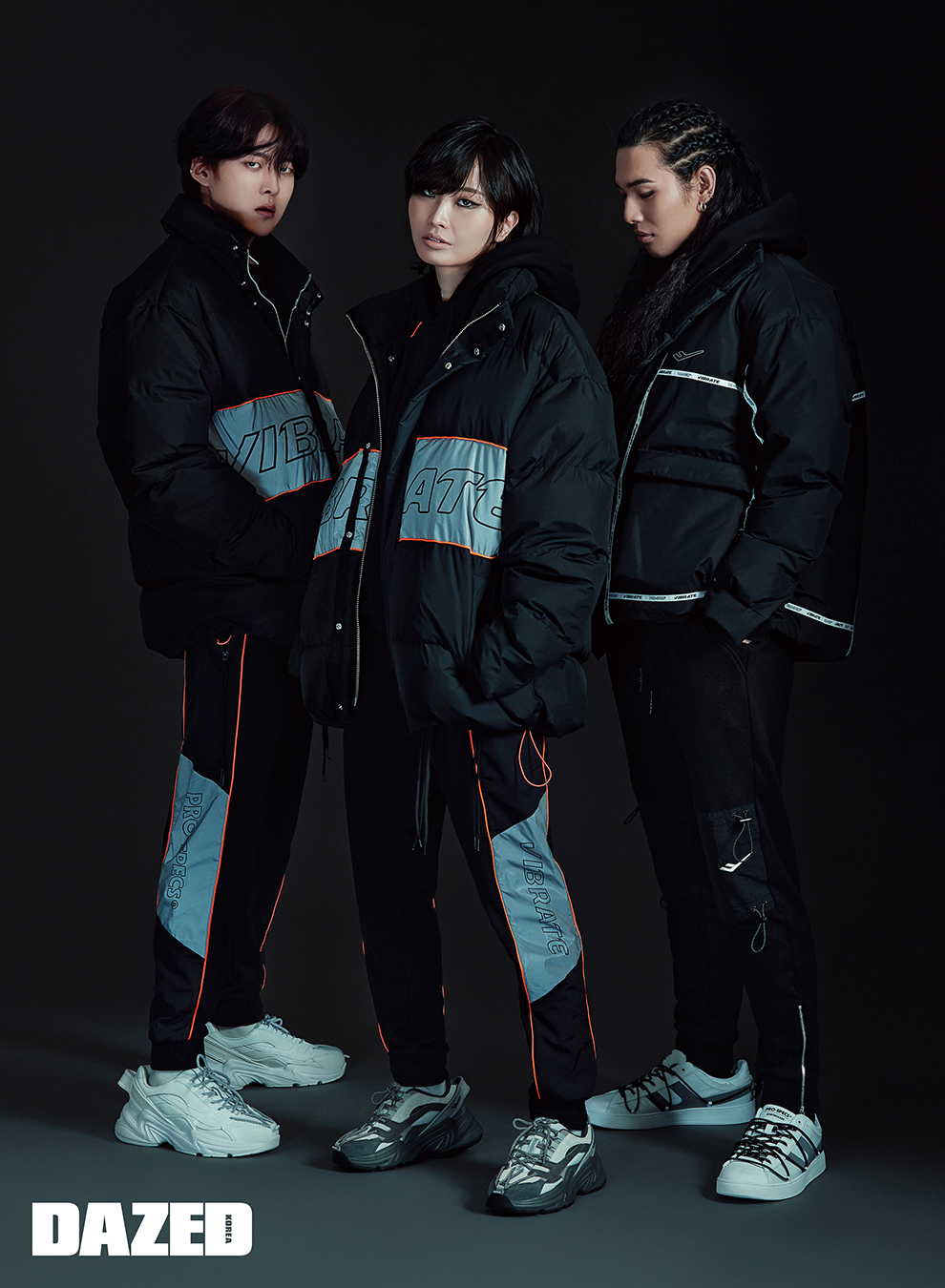 원대가 입은 오버핏 다운과 리플렉티브 트레이닝 팬츠, 뉴트로게이드 T1 스니커즈는 모두 프로스펙스 X 바이브레이트(Pro-specs X Vibrate). 선율이 입은 오버핏 다운과 리플렉티브 트레이닝 팬츠, 뉴트로게이드 T3 스니커즈는 모두 프로스펙스 X 바이브레이트(Pro-specs X Vibrate). 다로가 입은 파이핑 다운과 우븐 패치 트레이닝 팬츠, 뉴트로게이드 C1 스니커즈는 모두 프로스펙스 X 바이브레이트(Pro-specs X Vibrate).