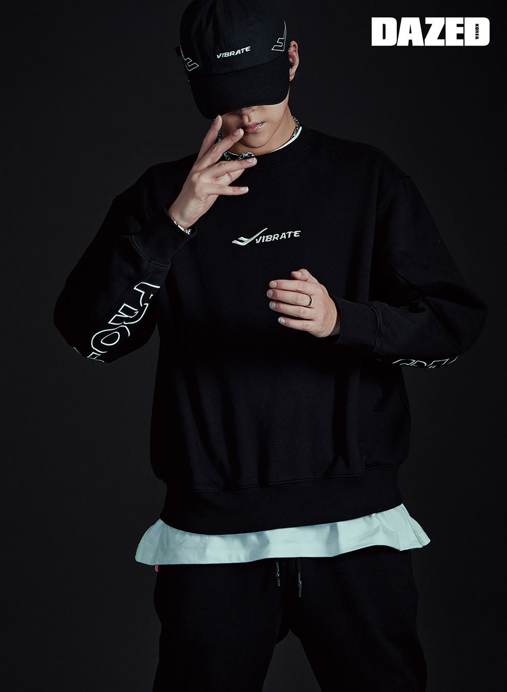 로고 맨투맨과 우븐패치 트레이닝 팬츠, 모자는 모두 프로스펙스X바이브레이트(Pro-specsXVibrate), 이너로 입은 티셔츠는 스타일리스트의 것.