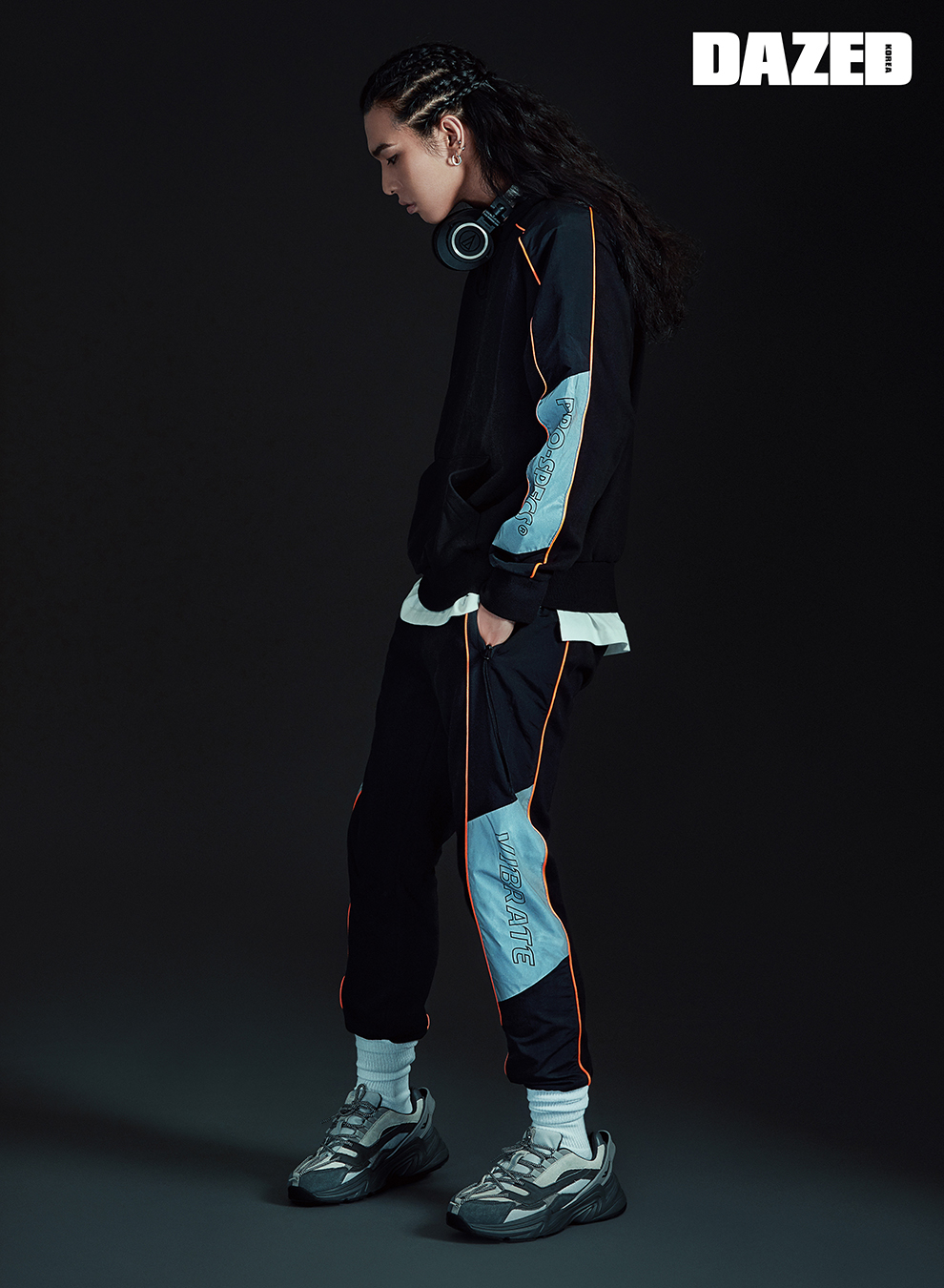 파이핑 다운과 리플렉티브 후디, 리플렉티브 트레이닝 팬츠 뉴트로게이드 T3 스니커즈는 모두 프로스펙스 X 바이브레이트(Pro-specs X Vibrate). 이너로 입은 티셔츠와 헤드폰, 양말은 모두 스타일리스트의 것.