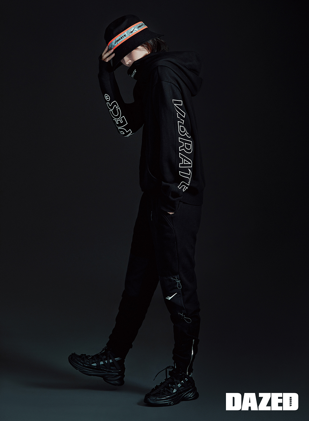 로고 후디와 우븐 패치 트레이닝 팬츠, 버킷 해트, 뉴트로게이드 R 스니커즈는 모두 프로스펙스X바이브레이트(Pro-specsXVibrate).