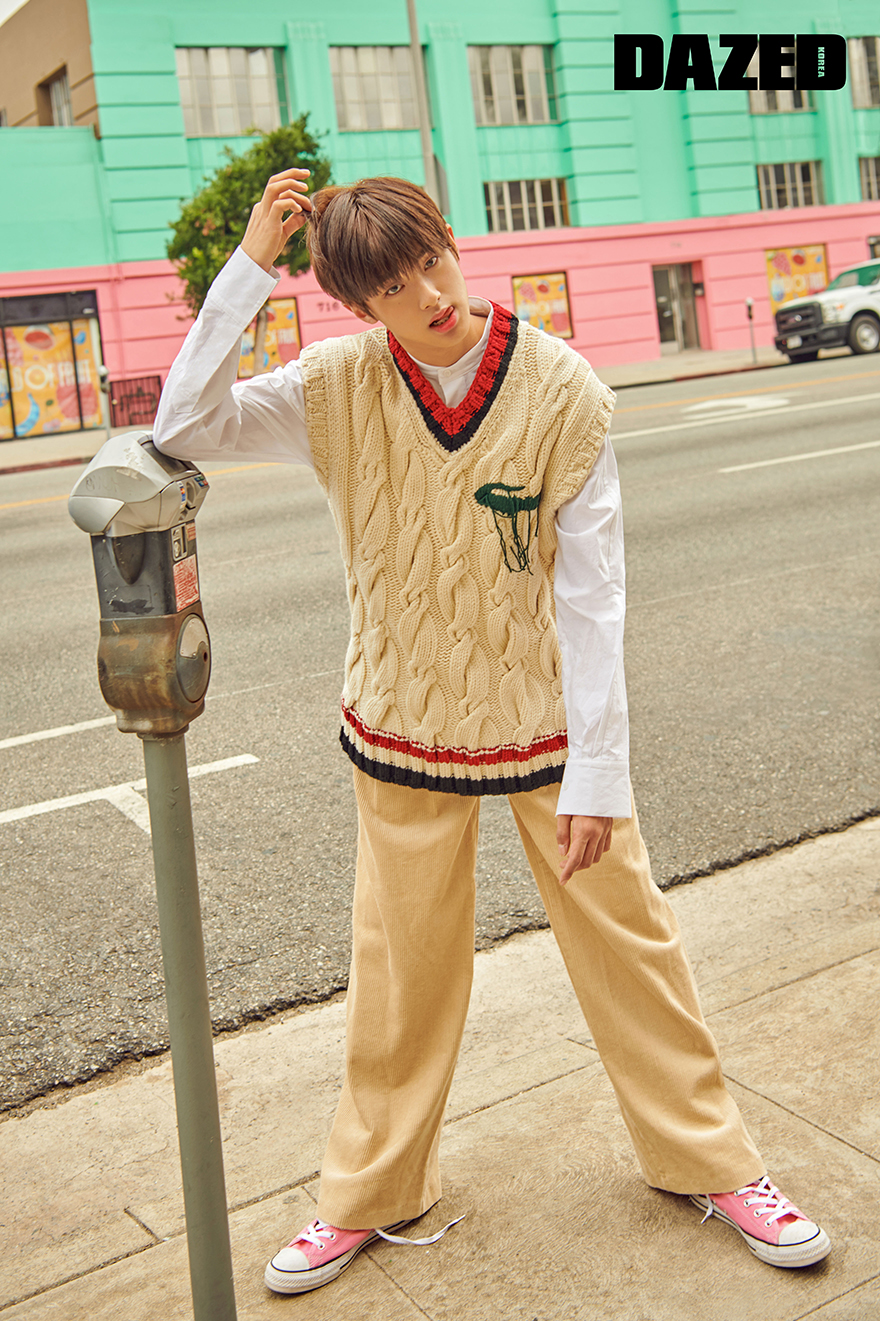 니트 베스트는 라코스테(Lacoste), 이너로 입은 셔츠는 디그낙(D.gnak), 팬츠는 로켓런치(Rocket X Lunch), 스니커즈는 컨버스(Converse).