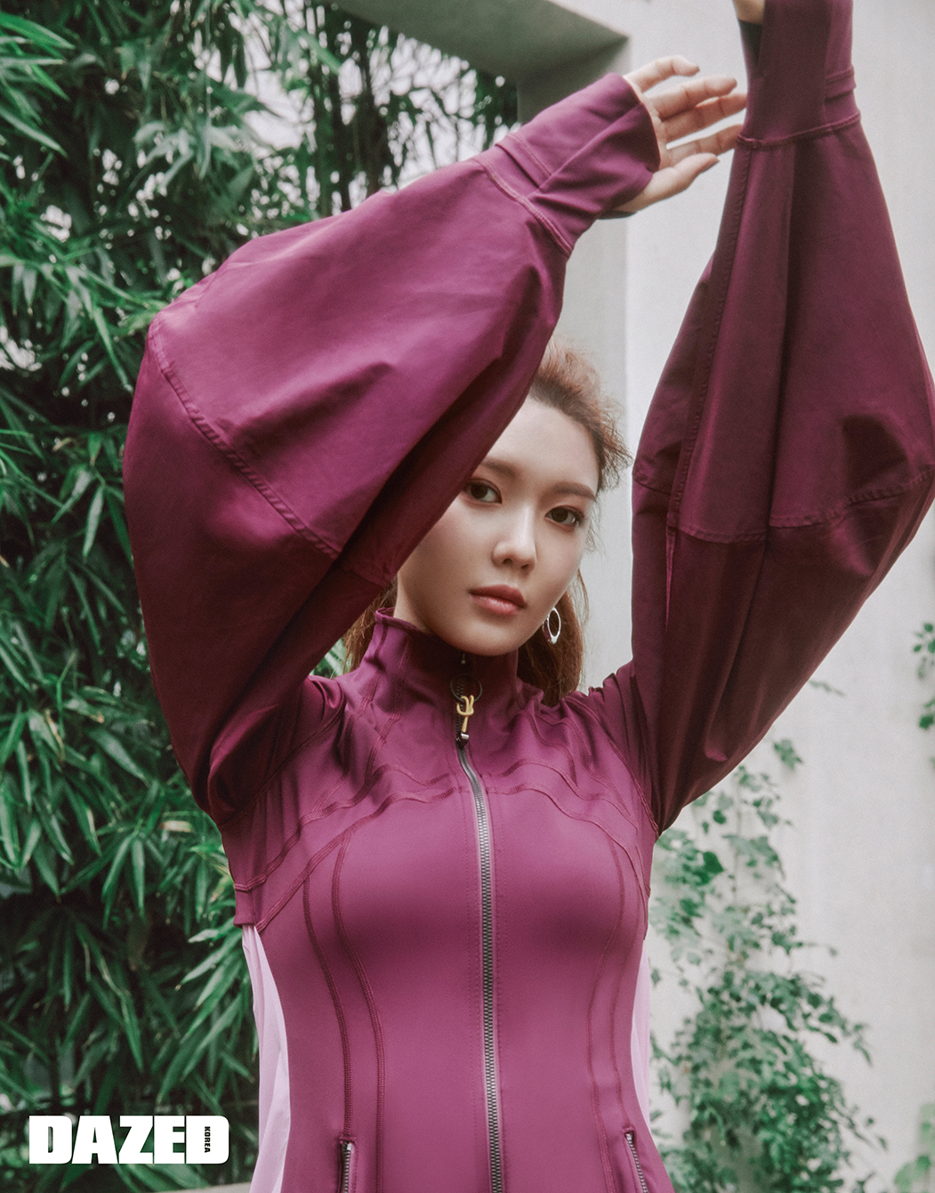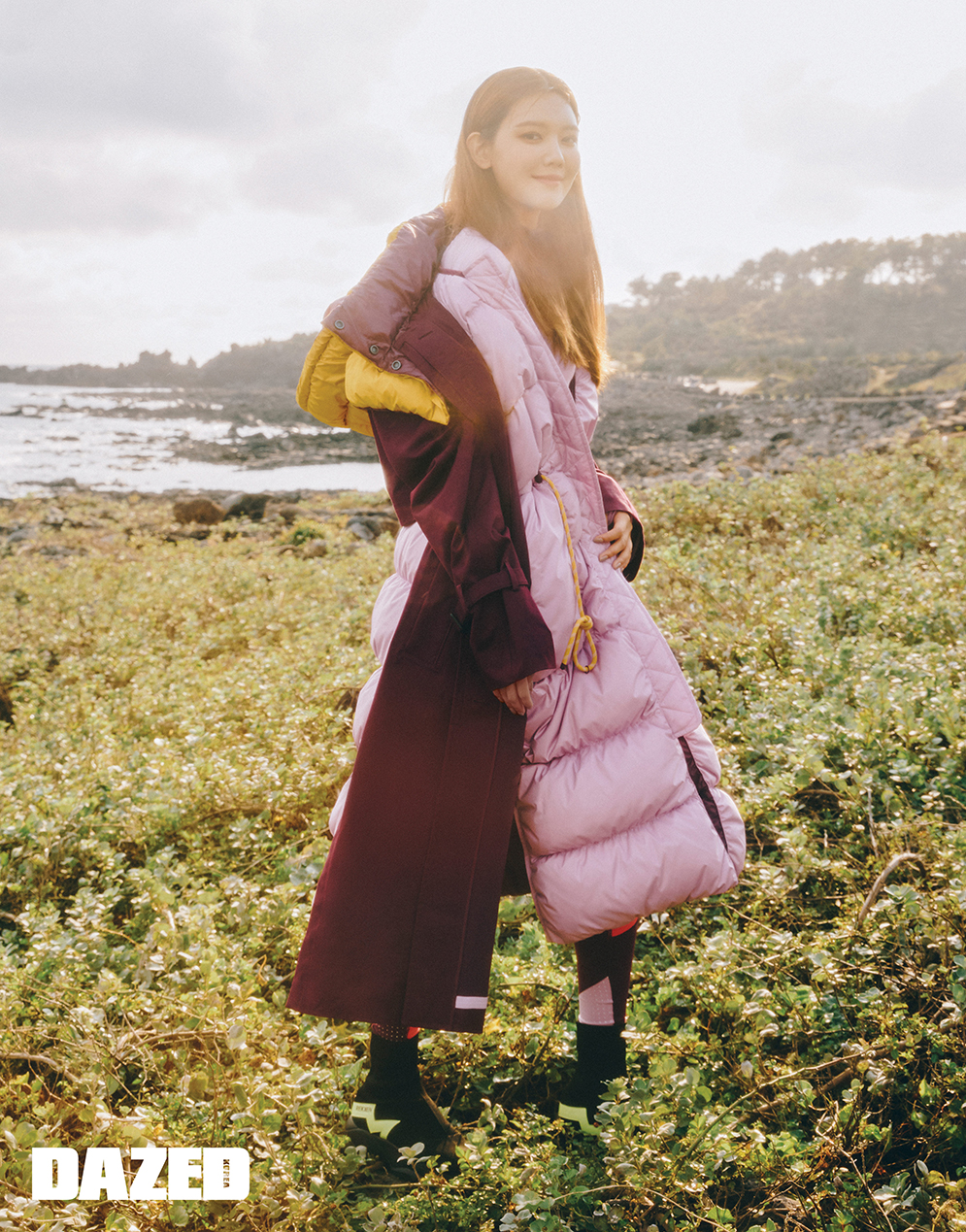 코트, 재킷, 베스트 등 자유자재로 연출 가능한 이너 익스펜스 인피니티 코트와 컬러 블로킹이 돋보이는 브레이크 뉴 그라운드 스위프틀리, 새틴 원단의 페이스 포워드 스커트는 모두 룰루레몬(lululemon), 스니커즈는 스타일리스트의 것.