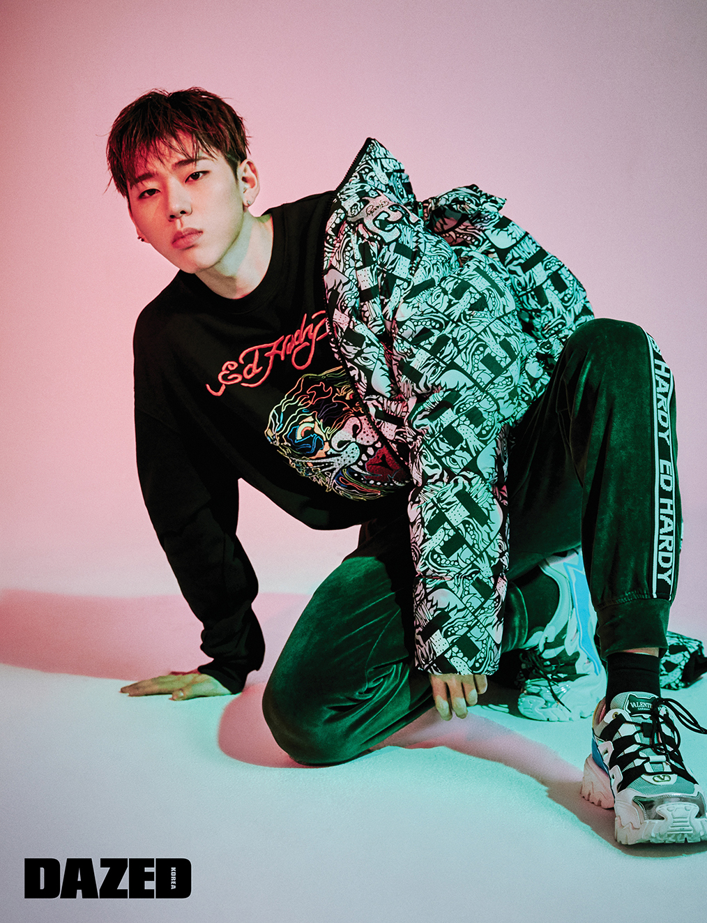 다운 재킷과 맨투맨, 조거 팬츠는 모두 에드하디(Ed Hardy), 슈즈는 스타일리스트의 것.