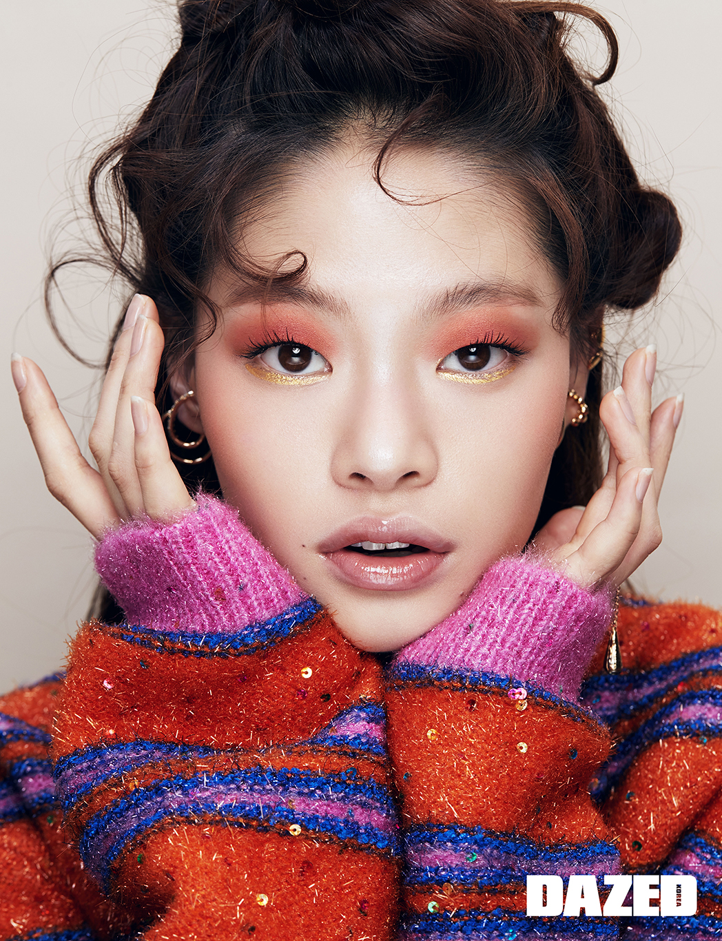 오렌지 니트 톱은 아쉬시 by 분더샵(Ashish by BOONTHESHOP), 반지는 지방시(Givenchy), 골드 이어링은 스타일리스트의 것.