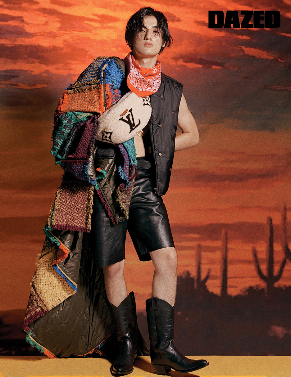어깨에 걸친 케이프 형태의 니트 패딩 코트는 3 몽클레르 그레노블(3 Moncler Grenoble), 웨스턴 부츠는 로데오(Rodeo), 스터드 장식 패딩 베스트는 모스키노(Moschino)로 토비의 것, 레더 쇼츠와 페이즐리 스카프는 에디터의 것.