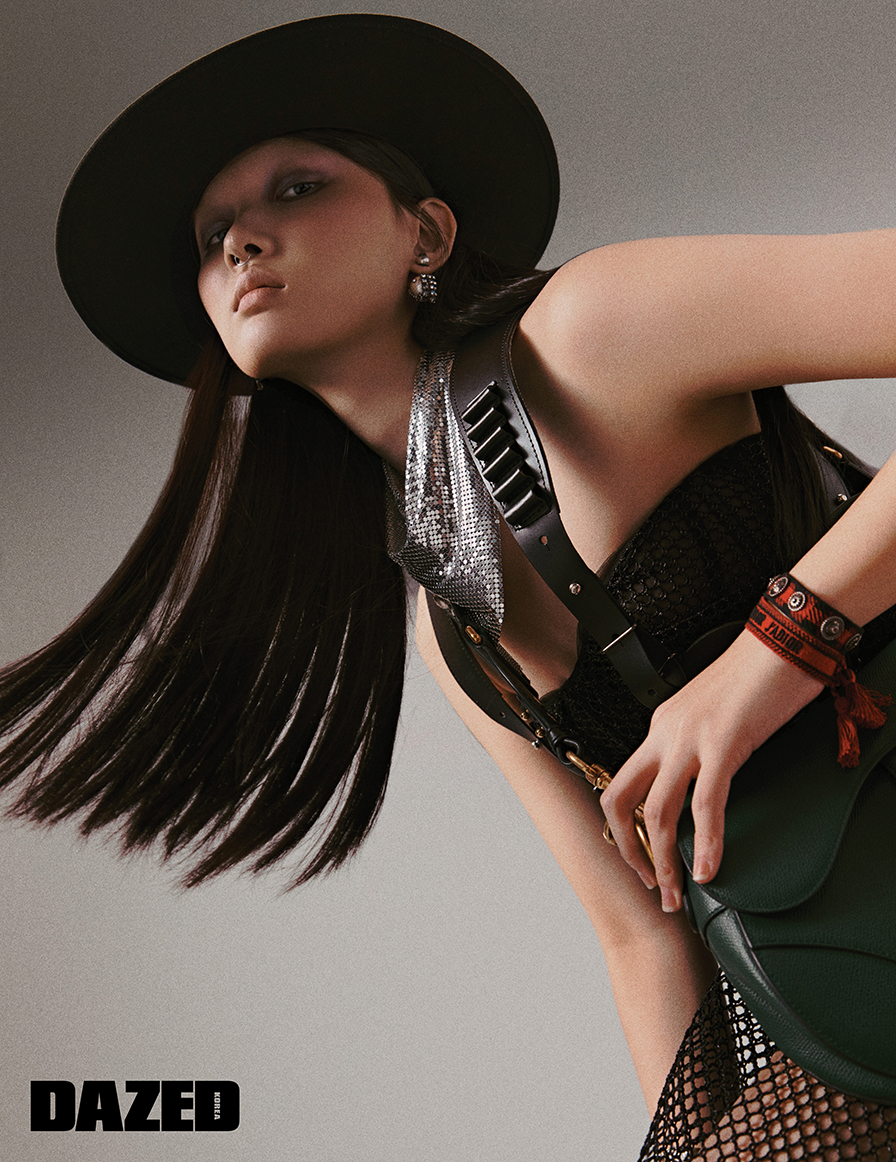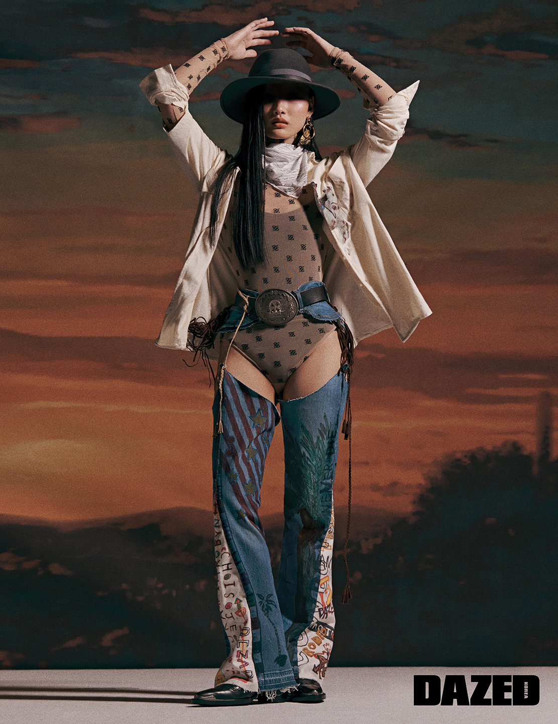 캘리그라피 스킨 컬러 보디슈트는 펜디(Fendi), 모자는 헬렌 카민스키(Helen Kaminski), 이어링은 베르사체(Versace), 셔츠는 텔파(Telfar), 벨트에 묶은 그라피티 핸드페인팅 데님 팬츠는 리바이스(Levi’s), 스카프는 질 샌더(Jil Sander) 2020년 S/S 컬렉션 인비테이션으로 받은 것, 벨트와 웨스턴 부츠는 에디터의 것.