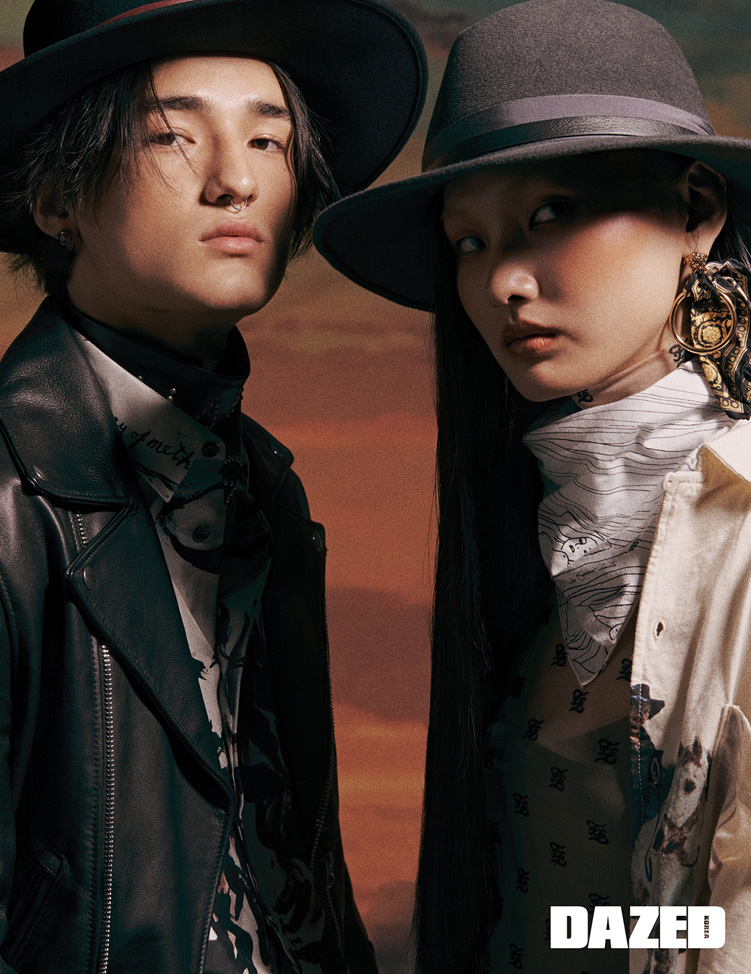 토비가 입은 레더 재킷은 아크네 스튜디오(Acne Studios), 얼굴 프린트 실크 셔츠는 디올 맨(Dior Men), 모자는 헬렌 카민스키(Helen Kaminski), 스카프는 샤넬(Chanel)로 에디터의 것. 주향이 입은 캘리그라피 스킨 컬러 보디슈트는 펜디(Fendi), 모자는 헬렌 카민스키(Helen Kaminski), 이어링은 베르사체(Versace), 셔츠는 텔파(Telfar), 스카프는 질 샌더(Jil Sander)로 모두 에디터의 것.