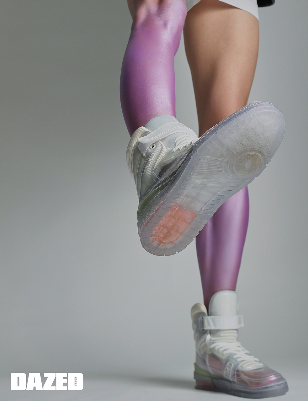 빛 반사에 따라 다양한 색이 나는 LV 트레이너 스니커즈는 루이 비통 남성 컬렉션(Louis Vuitton Men’s Collection).