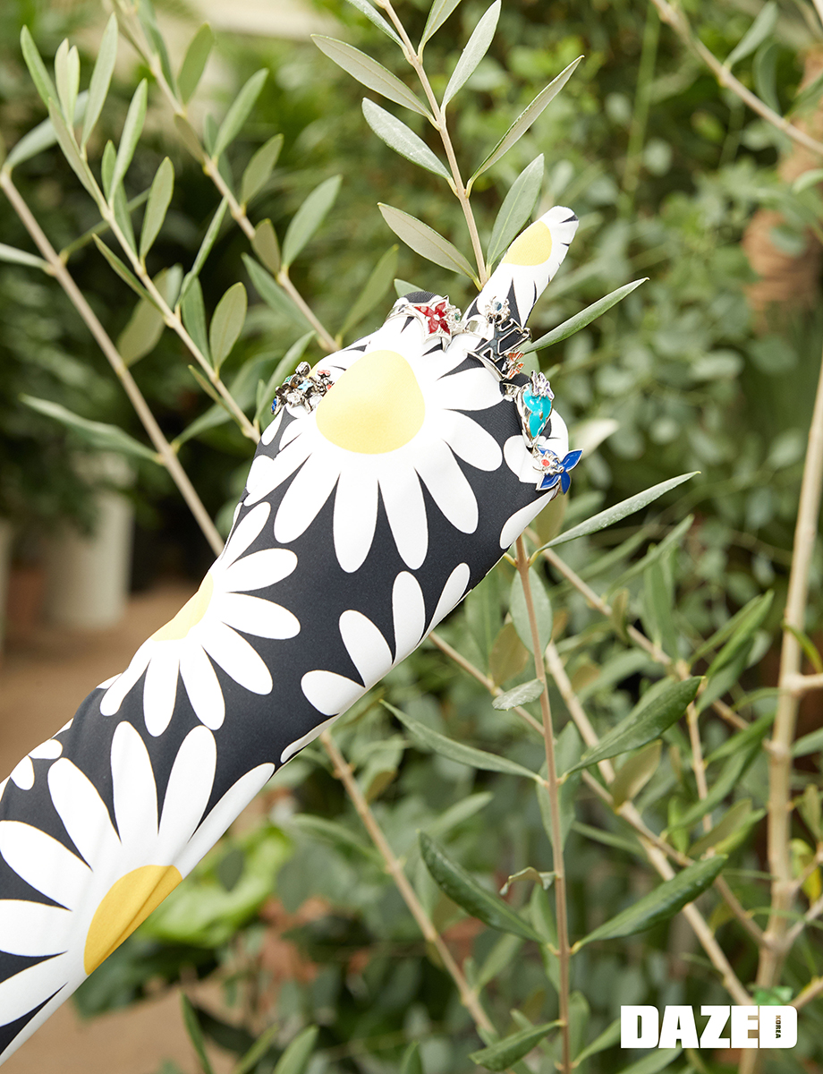 플라워 프린팅 보디슈트는 0 몽클레르 리차드 퀸(0 Moncler Richard Quinn), 페리테일 링 세트는 루이 비통(Louis Vuitton).