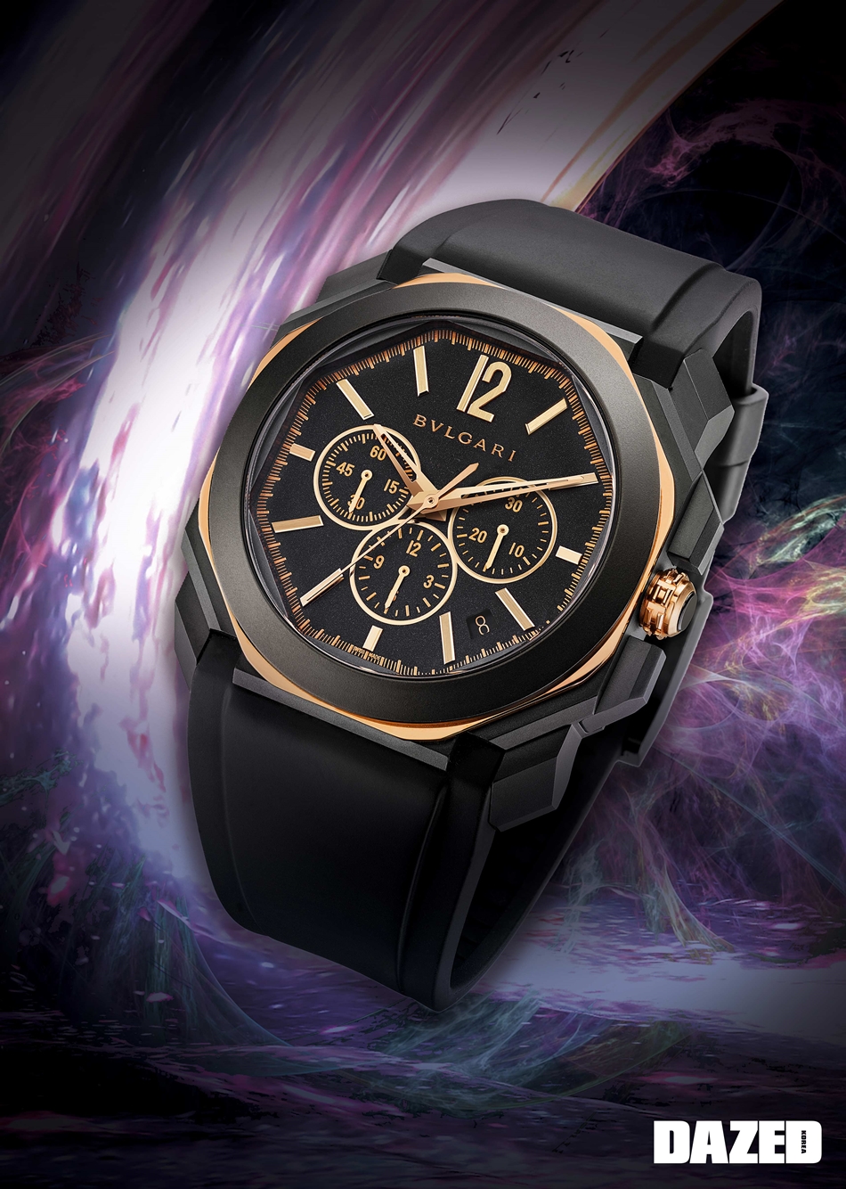 8각 베젤이 특징으로, 정교하게 디자인한 110개의 단면이 이루는 건축적 구조가 특별함을 더하는 옥토 오리지날 크로노그래프는 불가리(Bvlgari).