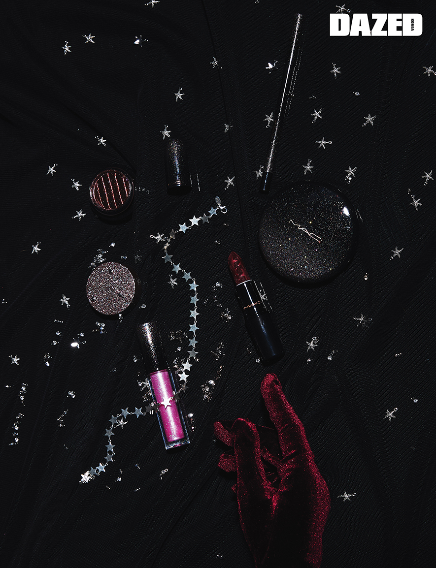 다크 바이올렛 피그먼트 안에 블루, 그린 펄이 함께 빛나는 벨벳 텍스처의 강렬한 펄 섀도는 스펠바인더 섀도우 0.5g 3만5000원대, 지속력이 뛰어난 매트 블랙 피니시의 워터프루프 아이라이너는 파워 포인트 아이 펜슬 1.2g 2만9000원대, 메탈릭한 펄이 함유된 포인트 립글로스는 립글라스 카운팅 스타즈 3.1ml 3만1000원대, 강렬한 발색과 글리터 피니시로 화려한 입술을 장식해줄 한정판 립스틱은 키스 오브 스타즈 립스틱 3g 3만4000원대, 얼굴에 윤기와 입체감을 더해줄 브론저는 오펄레센트 파우더 라이징 스타 9g 4만9000원대, 모두 (M.A.C).