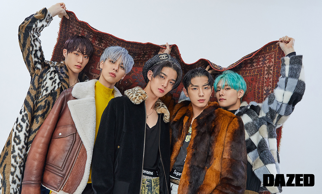 현석이 입은 코트는 닐 바렛(Neil Barret), 네크리스는 존 하디(John Hardy). BX가 입은 시어링 재킷은 벨루티(Berluti), 니트 톱은 제이린드버그(J.Lindberg). 배진영이 입은 퍼 트리밍 재킷은 닐 바렛(Neil Barret), 톱은 김서룡(Kimseoryong), 팬츠는 우영미(Wooyoungmi), 베레모는 벨앤누보(Bell & Nouveau). 용희가 입은 퍼 재킷은 벨앤누보(Bell & Nouveau), 톱은 스타일리스트의 것. 승훈이 입은 재킷은 챈스챈스(Chance Chance), 팬츠는 에르메네질도 제냐 XXX (Ermenegildo Zegna XXX), 톱은 스타일리스트 소장품.