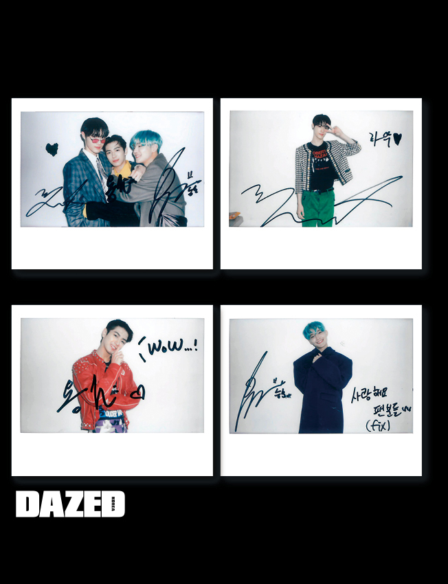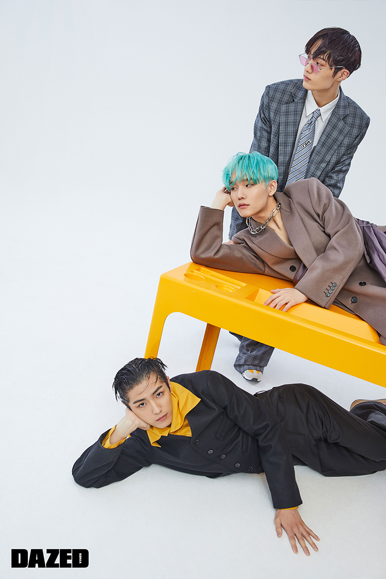 현석이 입은 의상은 모두 유저(Youser), 선글라스는 젠틀 몬스터(Gentle Monster), 슈즈는 나이키(Nike). 승훈이 입은 코트는 디올 맨(Dior Men), 네크리스는 포트레이트 리포트(Portrait Report). 용희가 입은 셔츠는 우영미(Wooyoungmi), 재킷은 르메르(Lemaire), 팬츠는 찬스찬스(Chancechance).