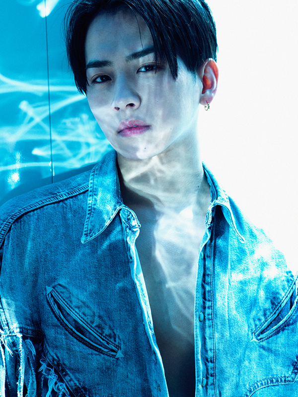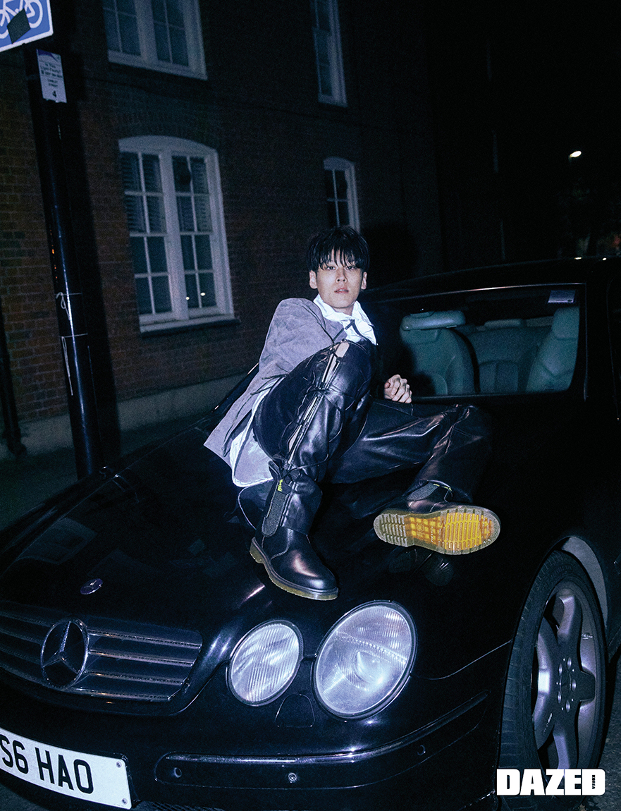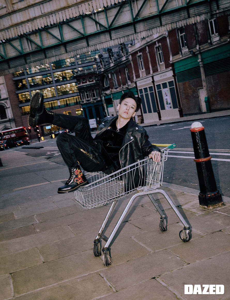 라이더 재킷은 디젤(Diesel), 벨벳 재킷은 모호(Moho), 블랙 팬츠는 디스퀘어드2(Dsquared2), 네크리스는 짱유의 것, 시선을 사로잡는 드래곤 자수 디테일로 펑키하고 반항적인 애티튜드를 드러낸 1460 부츠는 닥터마틴(Dr. Martens).