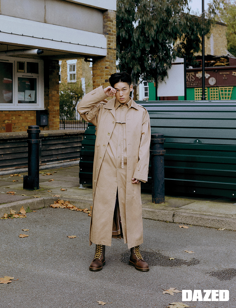 베이지 셔츠와 트렌치코트는 판영(Fanyoung), 슈레이스 포인트로 빈티지한 감성이 묻어나는 유연한 소재감의 브라운 컬러 1460 부츠는 닥터마틴(Dr. Martens).