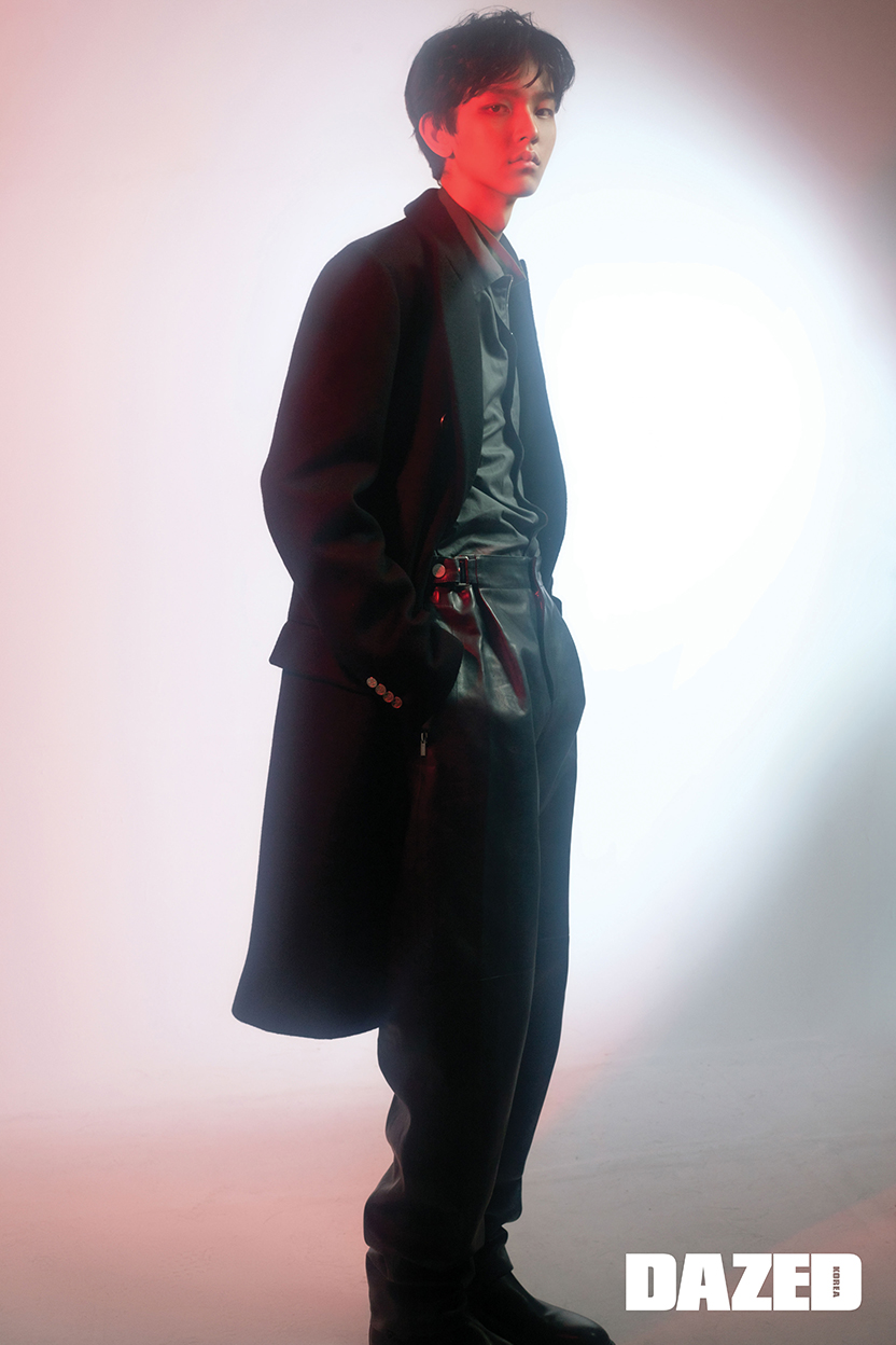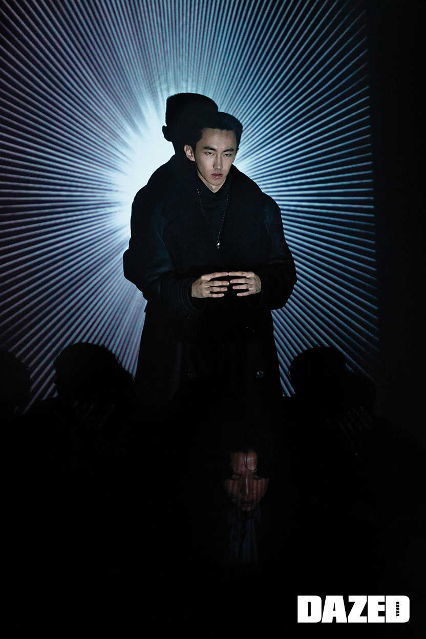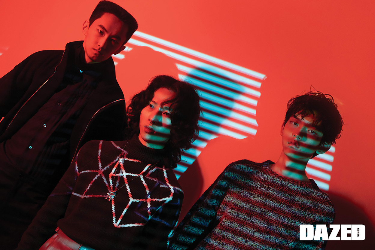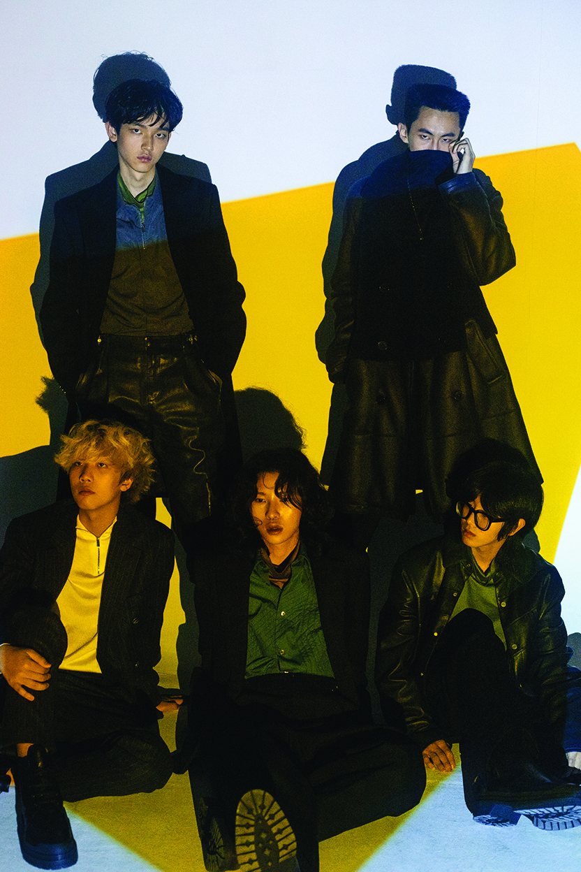 지용이 입은 방수 소재 더블 캐시미어 코트, 지퍼 디테일의 코튼 포플린 셔츠, 그린 컬러 코튼 저지 터틀넥 풀오버, 네이비 컬러 카프스킨 시카고 팬츠는 모두 에르메스(Hermès). 바노가 착용한 시어링 양가죽 더블브레스트 코트, 네이비 코튼 저지 터틀넥 풀오버, 울 실크 혼방 룩셈부르크 팬츠, 드래곤 모티브의 네크리스는 모두 에르메스(Hermès). 영케이가 입은 메리노 니들 링으로 서울 스트라이프 패턴 라인을 만든 네이비 레더 블루종, 화이트 실크 집업 풀오버, 블랙 팬츠는 모두 에르메스(Hermès). 로빈이 입은 울 소재의 네이비 재킷과 코튼 포플린 소재 테이퍼드 셔츠, 캐멀 색상 코튼 저지 터틀넥 풀오버, 지퍼 디테일의 시카고 팬츠는 모두 에르메스(Hermès). 승언이 입은 블루 컬러 램스킨 오버사이즈 셔츠와 코튼 저지 터틀넥 풀오버, 지퍼 디테일의 시카고 팬츠, 송아지 가죽 첼시부츠는 모두 에르메스(Hermès).