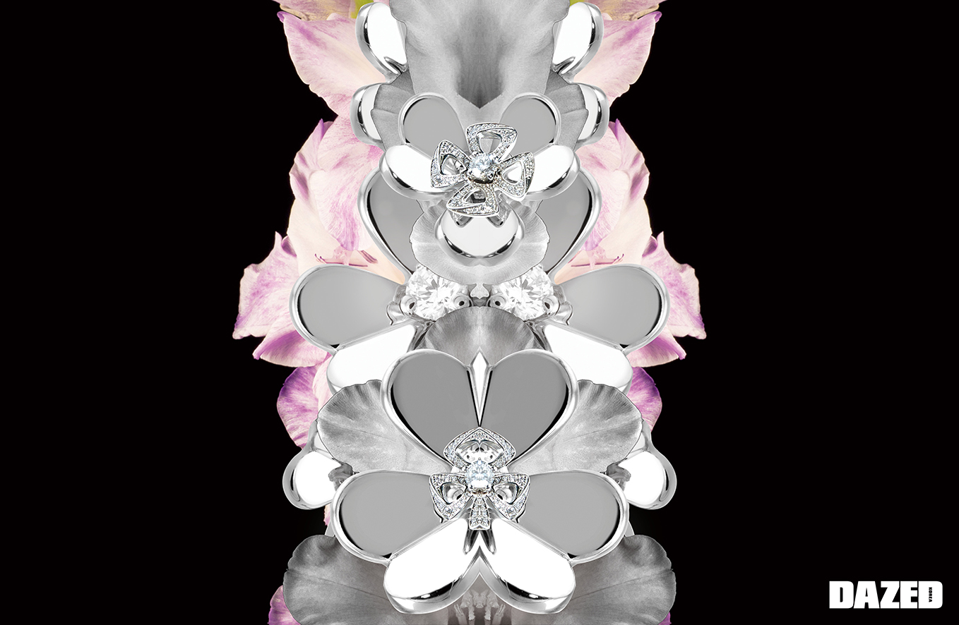 중앙에 라운드 다이아몬드를 세팅한 3개 꽃잎 이어링은 반클리프 아펠(Van Cleef & Arpels), 다이아몬드를 파베 세팅한 4개 꽃잎 이어링은 불가리(Bvlgari).