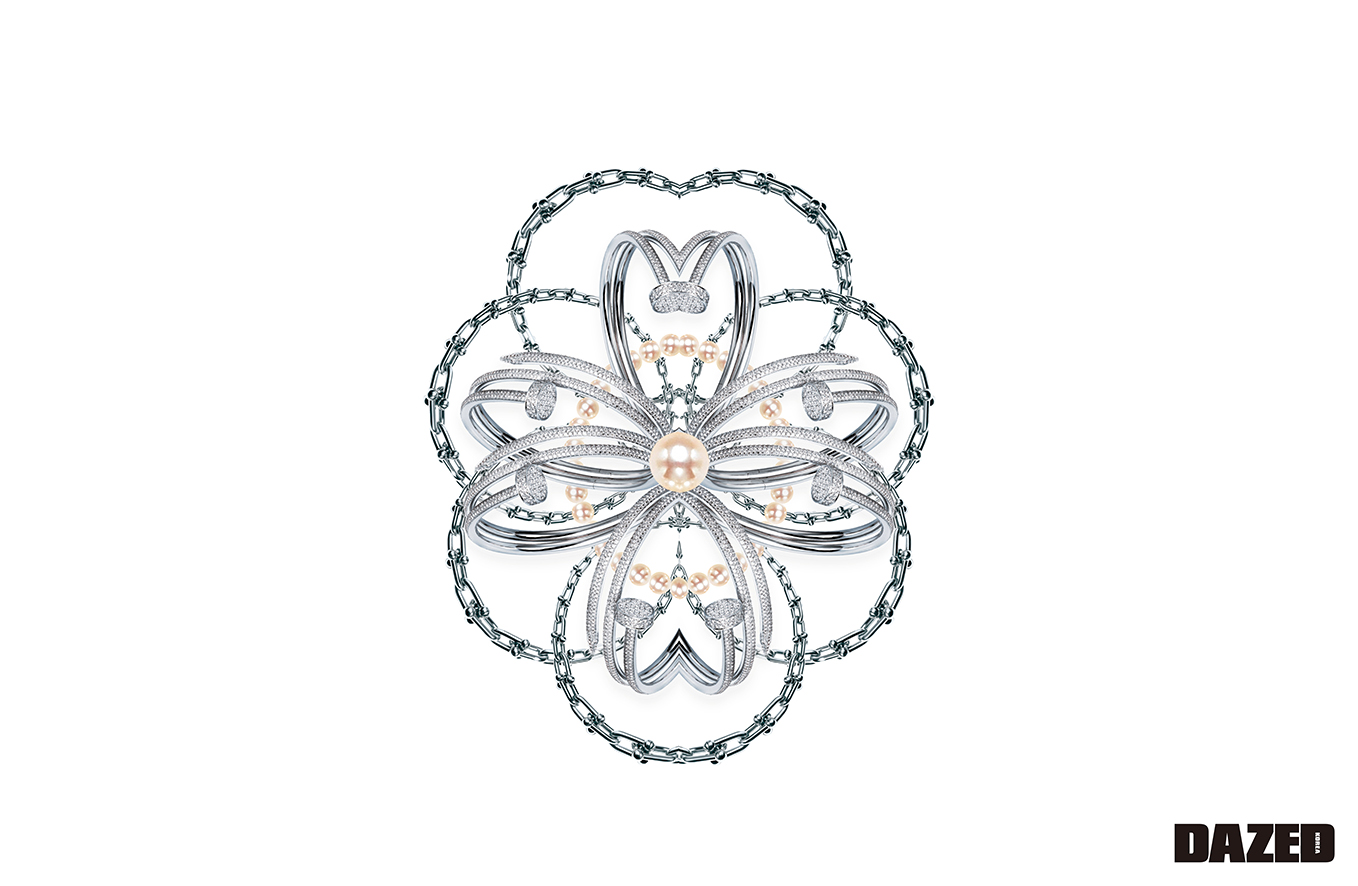 사쿠라 골드와 아코야진주 네크리스는 타사키(Tasaki), 볼과 체인을 엮은 링크 네크리스는 티파니(Tiffany & Co.), 못이 팔목을 감싸는 디자인의 브레이슬릿은 까르띠에(Cartier).