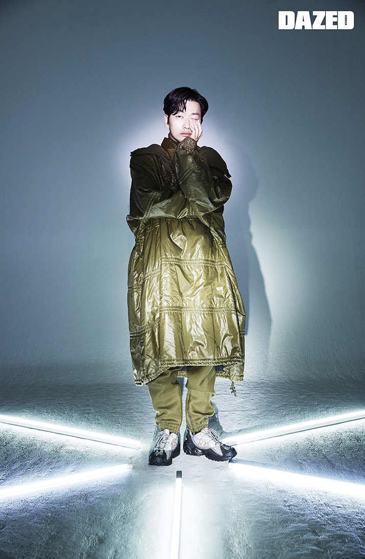 트렌치코트는 메종 마르지엘라 by 육스닷컴(Maison Margiela by YOOX.com), 팬츠는 언어펙티드(Unaffected), ML703 스니커즈는 뉴발란스(New Balance), 이너로 입은 터틀넥 톱과 티셔츠, 양말은 모두 스타일리스트의 것.