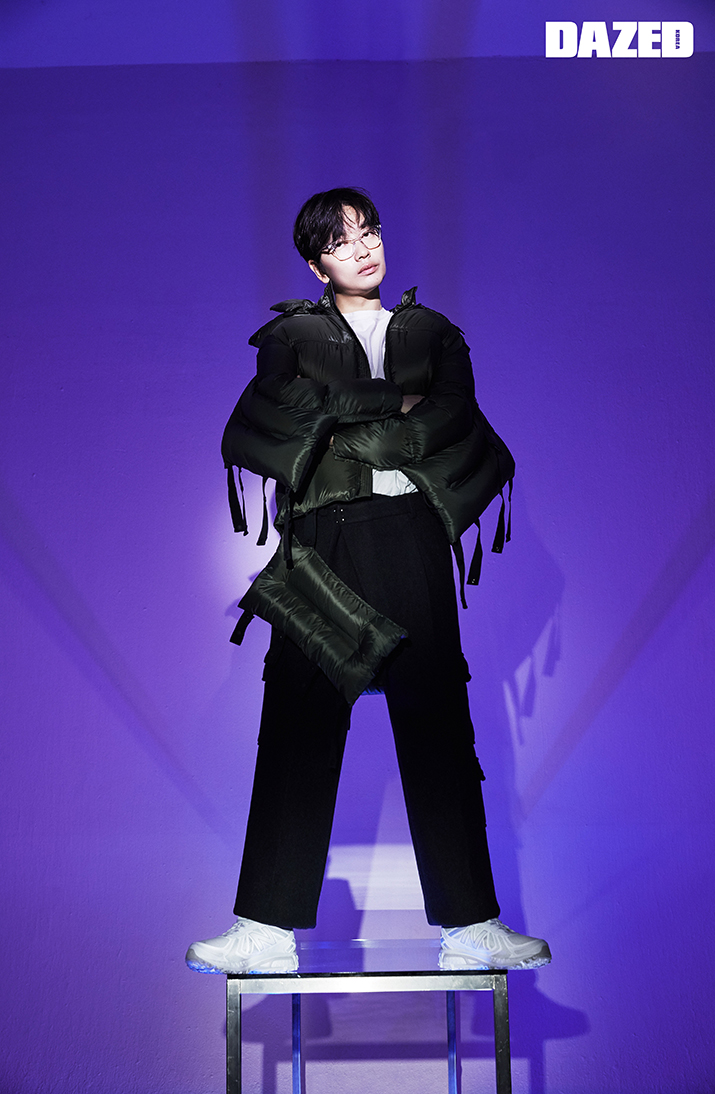 점퍼는 5 몽클레르 크레이그 그린(5 Moncler Craig Green), 팬츠는 앤더슨벨(Andersson Bell), 안경은 마노모스(Manomos), MT410v5 스니커즈는 뉴발란스(New Balance), 티셔츠와 양말은 스타일리스트의 것.