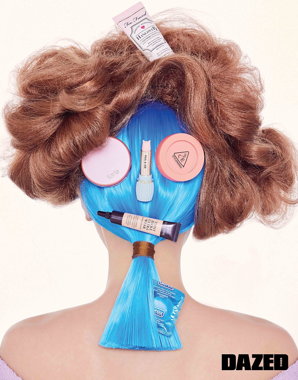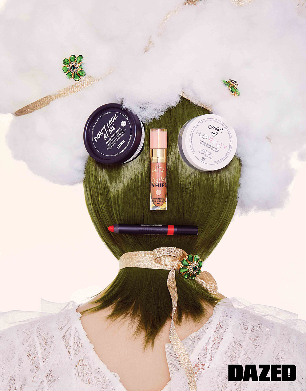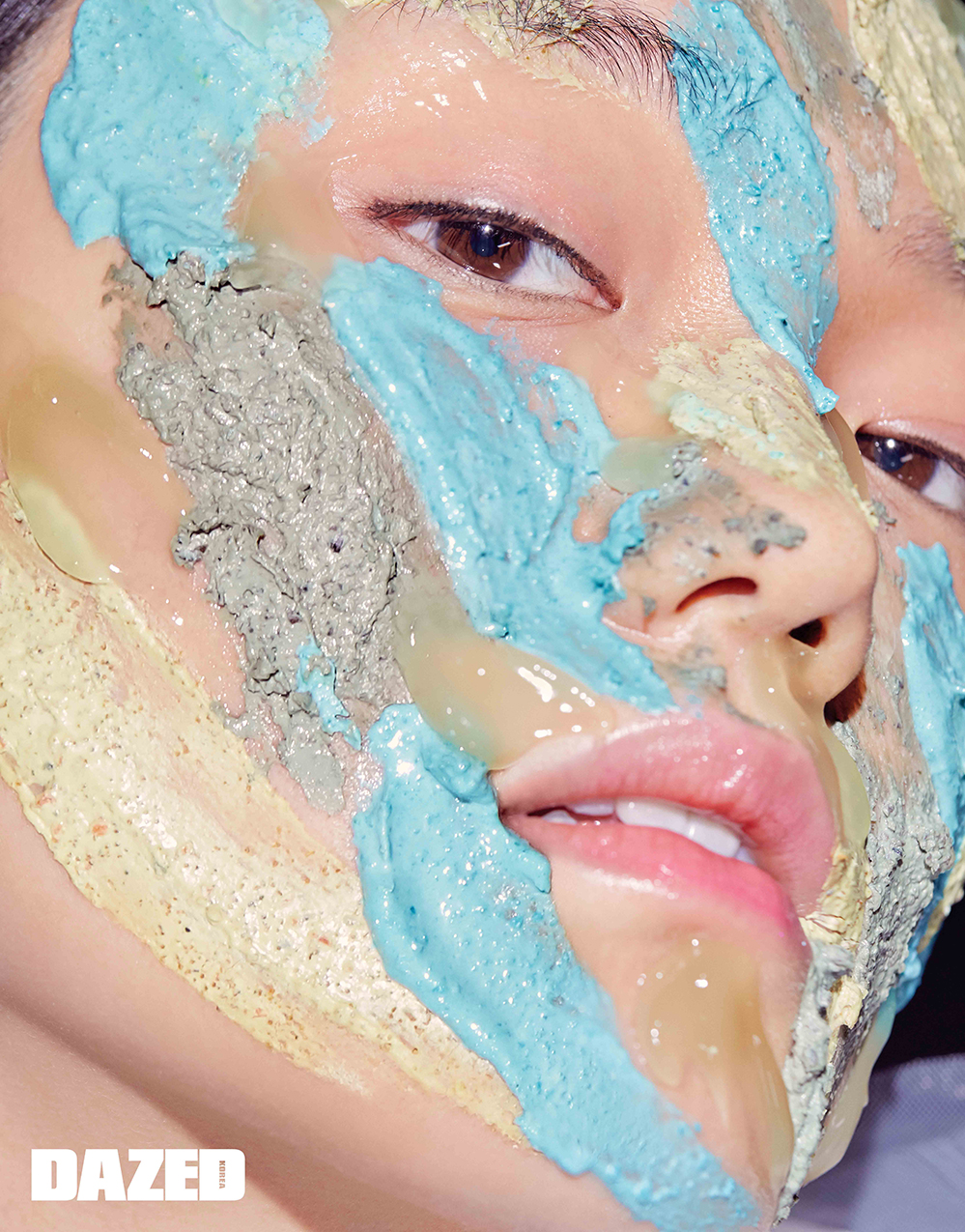모델이 얼굴에 바른 민트컬러 제형은 레몬즙과 자몽 성분이 바르는 즉시 피부에 생기를 더하는 페이셜 마스크 돈트 룩 앳 미 125g 2만5000원대, 카키 그린 컬러 마스크는 페퍼민트 오일과 카올린 성분이 피부의 노폐물과 부기를 케어하는 워시-오프 팩 마스크 오브 매그너민티 315g 4만원대, 파스텔 옐로 컬러 제형은 바나나와 일리페 버터를 함유해 피부 속부터 수분감이 느껴지는 워시-오프 마스크 팩 오티픽스 125g 2만5000원대, 모두 러쉬(Lush).