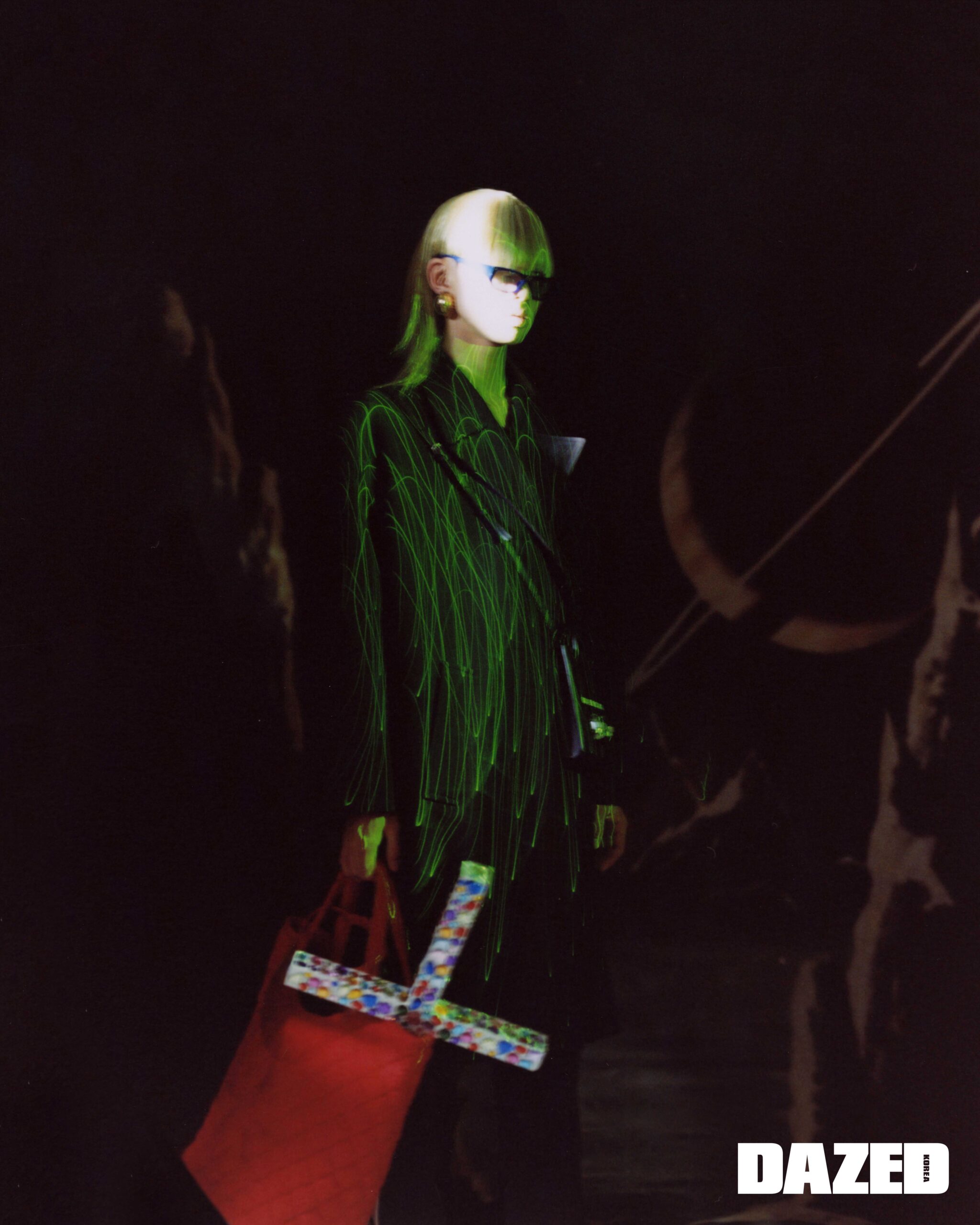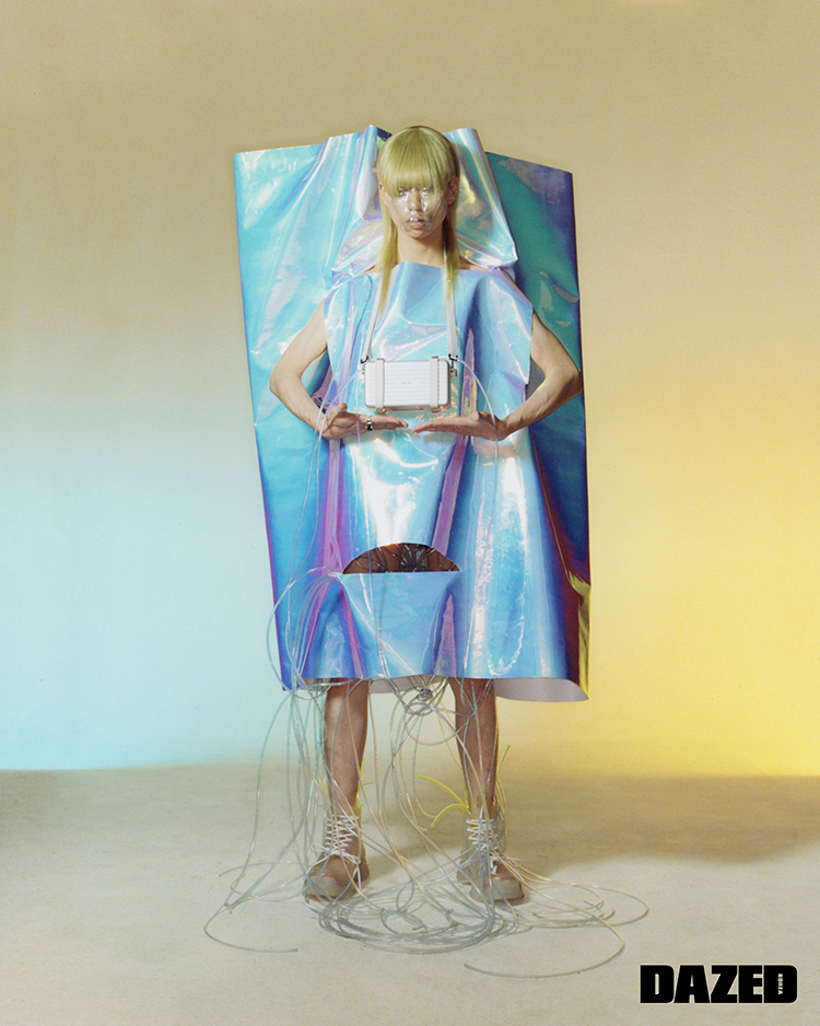 지파쿠가 착용한 실리콘 튜브로 만든 팬츠는 뮌(Münn), 리모와와 협업한 미니 백과 PVC 소재의 부츠는 디올 맨(Dior Men).