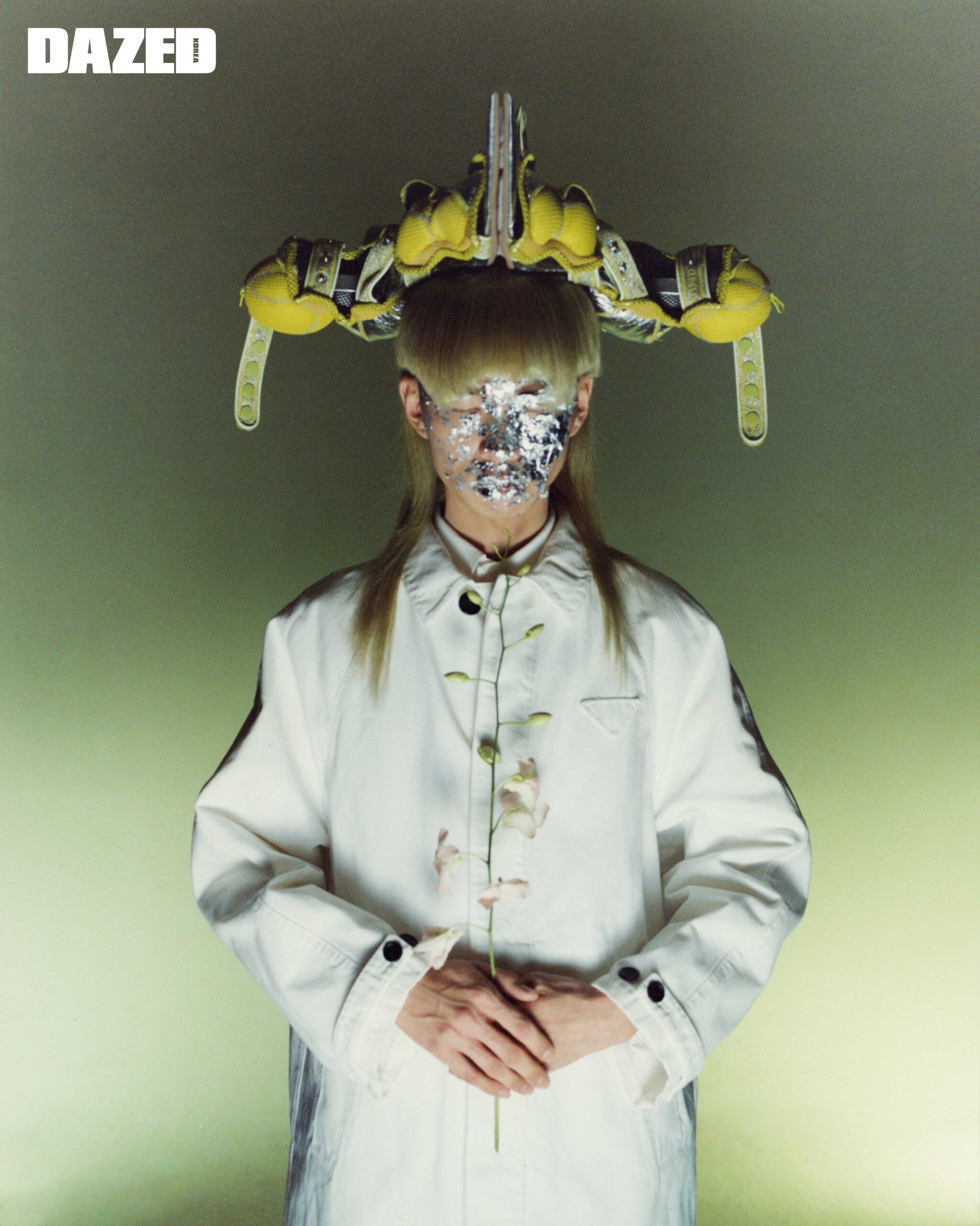 지파쿠가 착용한 화이트 트렌치코트와 셔츠는 프라다(Prada), 헤드피스로 연출한 슈즈는 윈도우센(Windowsen).